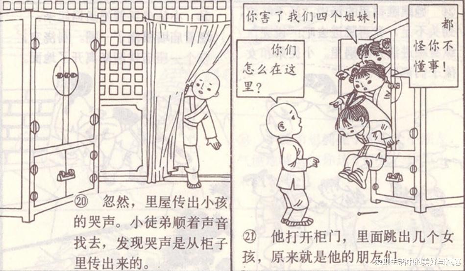 忽然,里屋传出小孩的哭声。小徒弟顺着声音找去,发现哭声是从柜子里传出来的。