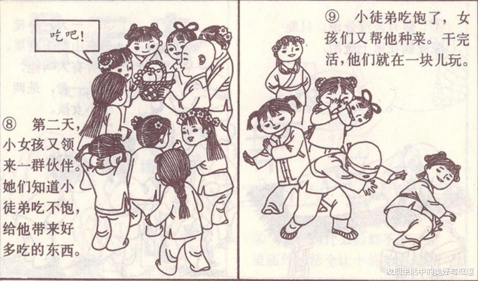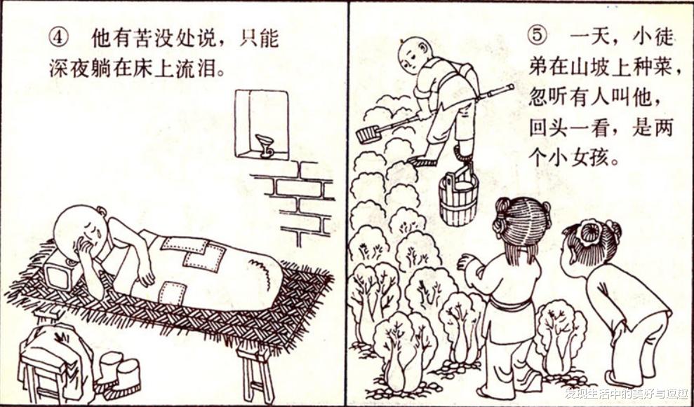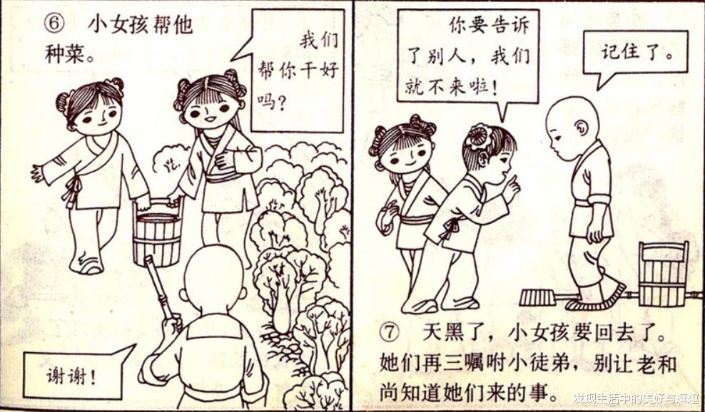 一天,小徒弟在山坡上种菜,忽听有人叫他,回头一看,是两个小女孩。