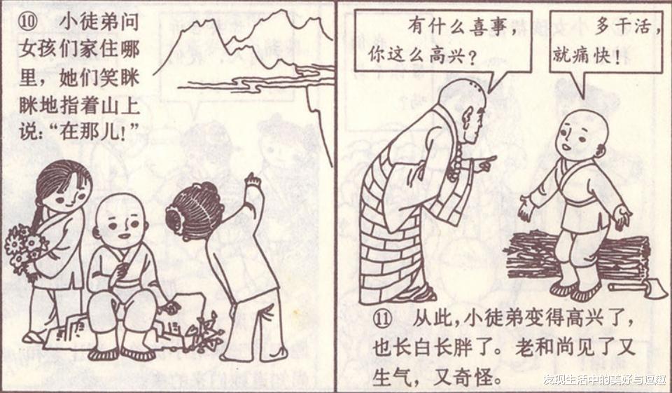 从此,小徒弟变得高兴了,也长白长胖了。老和尚见了又生气,又奇怪。问他:你有什么喜事,你这么高兴?小徒弟说,多干活就痛快!