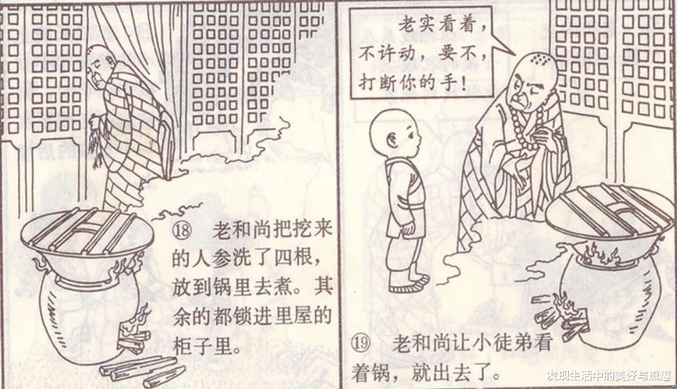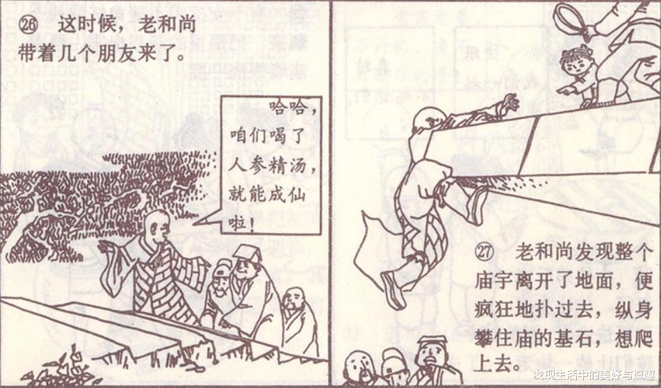 小时候对这篇连环画的印象是小和尚在河边与小伙伴们捉螃蟹、老和尚顺着红线见到的人参茎叶。