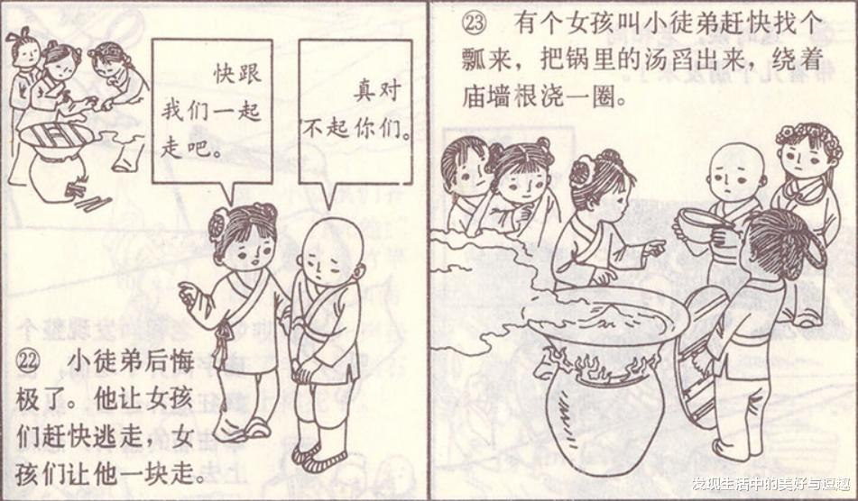 有个女孩叫小徒弟赶快找个瓢来,把锅里的汤舀出来,绕着庙墙根浇一圈。