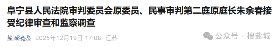 2025年12月19日,江苏阜宁县纪检监察机关发布重磅消息:阜宁县人民法院审判委员会原委员、民事审判第二庭原庭长朱余春因涉嫌严重违纪违法,目前正接受阜宁县纪委监委的纪律审查和监察调查。这一消息再次释放出全面从严治党、持续深化政法系统反腐的强烈信号,引发社会广泛关注。