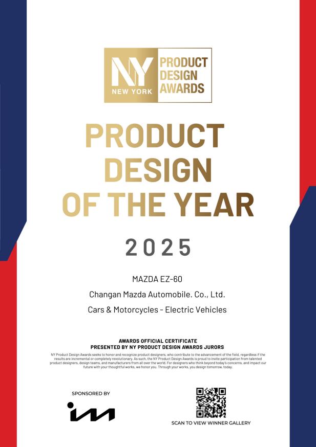 短短数月内,长安马自达EZ-60连续将纽约产品设计奖、Titan创新奖、缪斯设计奖铂金奖和年度最佳设计大奖四项国际荣誉收入囊中,实现了中国智造新能源SUV在国际设计奖项中的首例“大满贯”。