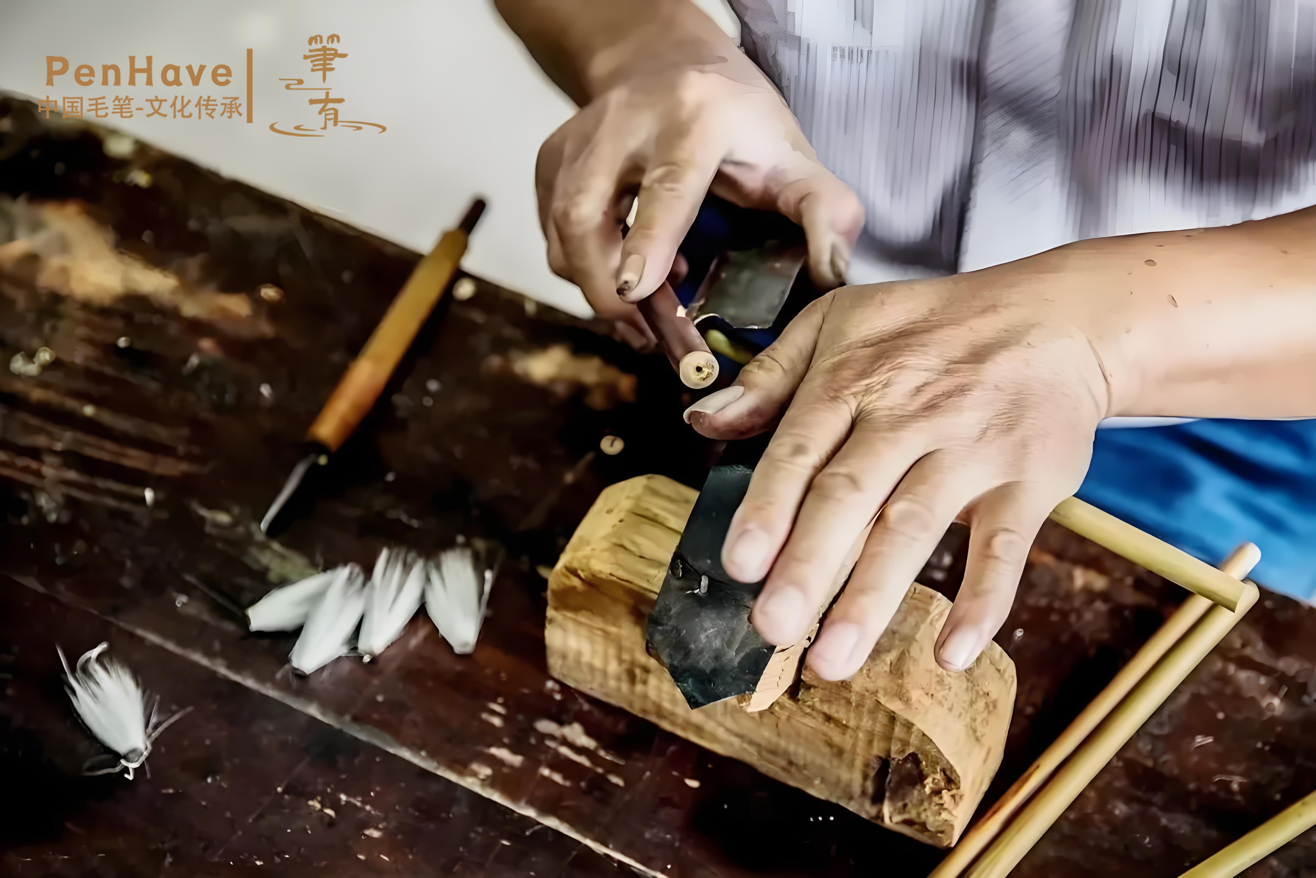 齐毫(毫厘必较,根根如线): 将分好层的毛片,小心地捋顺,毛根朝外,用特制的锋利切刀(如宝剑般寒光凛冽),在光滑的骨板或玉石板上,屏息凝神,一刀切下。要求毛根断面必须如线般平直、整齐划一。毫厘之差,将直接影响笔头与笔杆的结合牢固度以及书写的稳定性。这“一刀定乾坤”的功夫,非数十年苦功不能掌握。