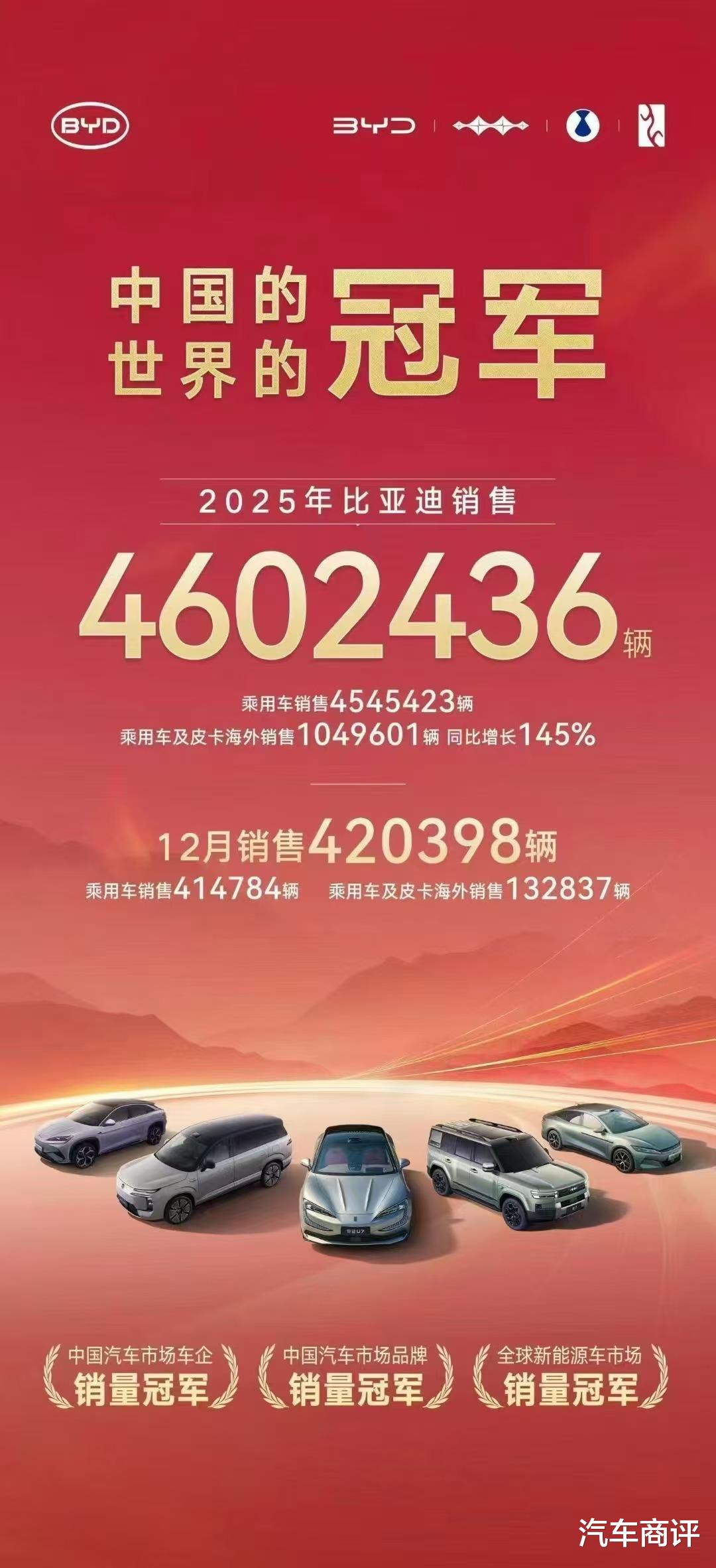 比亚迪,以所有人都想不到的方式,成为了NO.1,更准确的说,是全球第一。官方最新数据显示,比亚迪在2025全年新能源汽车总销量达到460.2万辆,再次坐稳全球最大新能源汽车车企的地位。