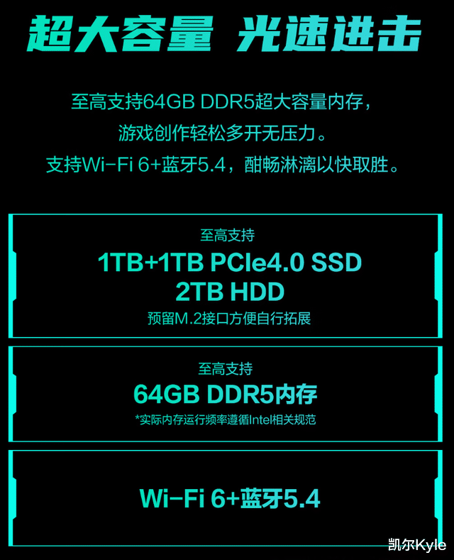 天选6X标配2×16GB DDR5高频内存,能为《使命召唤》《战地》等需要频繁加载地图与资源的大型FPS游戏中提供性能支持,让玩家在地图场景、枪械道具切换时更加流畅自然;硬盘方面,整机搭载1TB PCIe 4.0 SSD,能为游戏的安装、启动、读档载入时间大幅缩短。此外,对于游戏库庞大的玩家,该主机还提供了充裕的升级空间,最高支持64GB内存及“2T PCIe 4.0 SSD+2T HDD”的混合存储方案,完美兼顾了极致速度与海量仓储的需求。