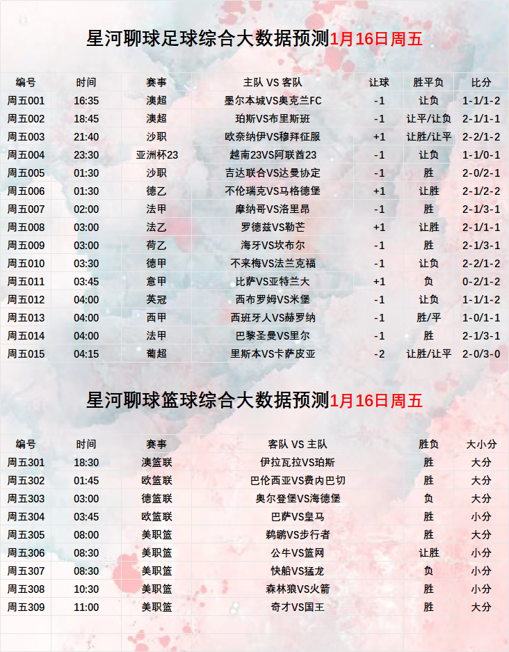 2026年1月16日 【星河聊球篮球足球扫盘】五大联赛 美职篮