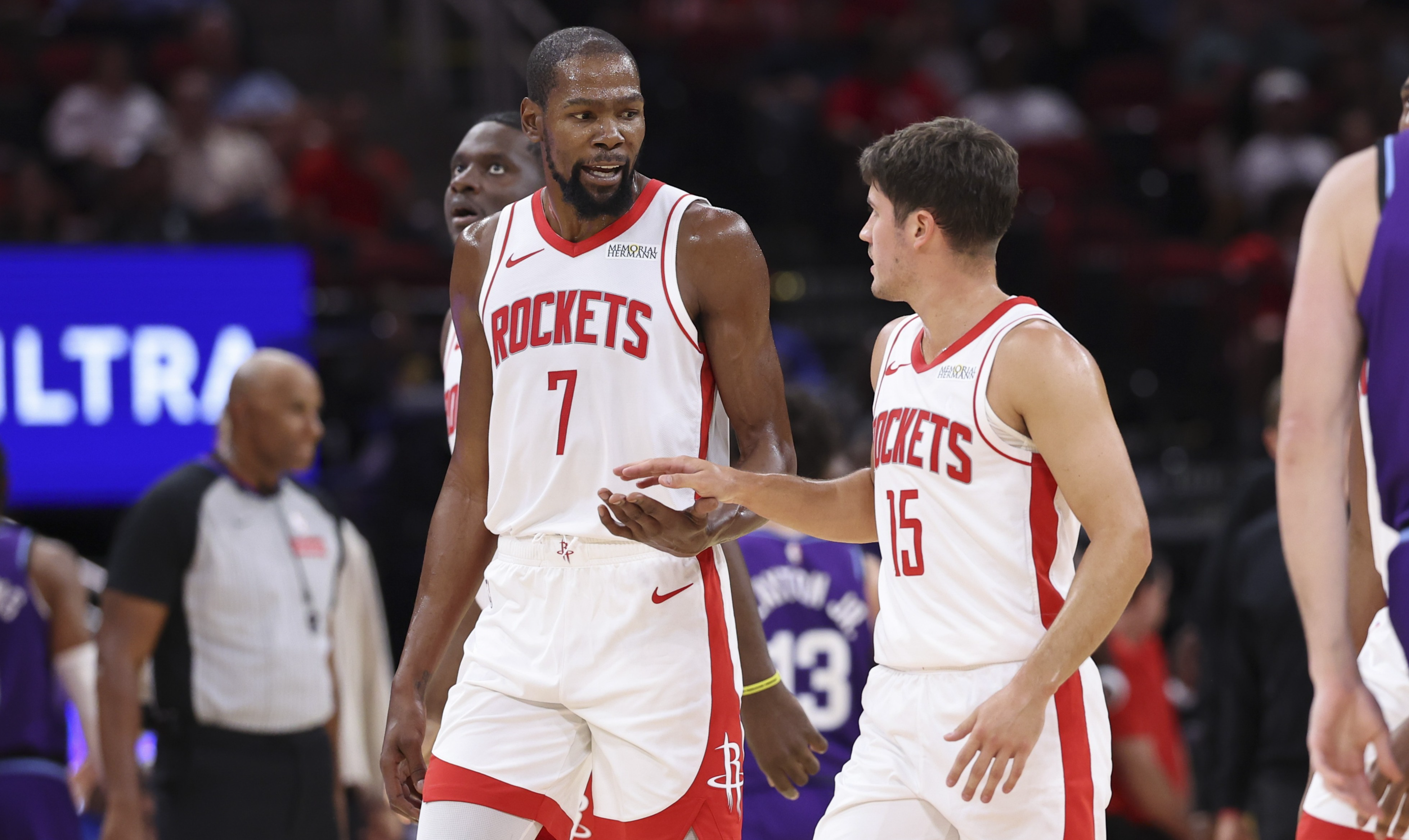 加时赛,谢泼德频频被德罗赞和施罗德点名,予取予求,火箭的阵地战因为杜兰特被夹击而陷入瘫痪,阿门和杜兰特的反击苦苦维持局面。