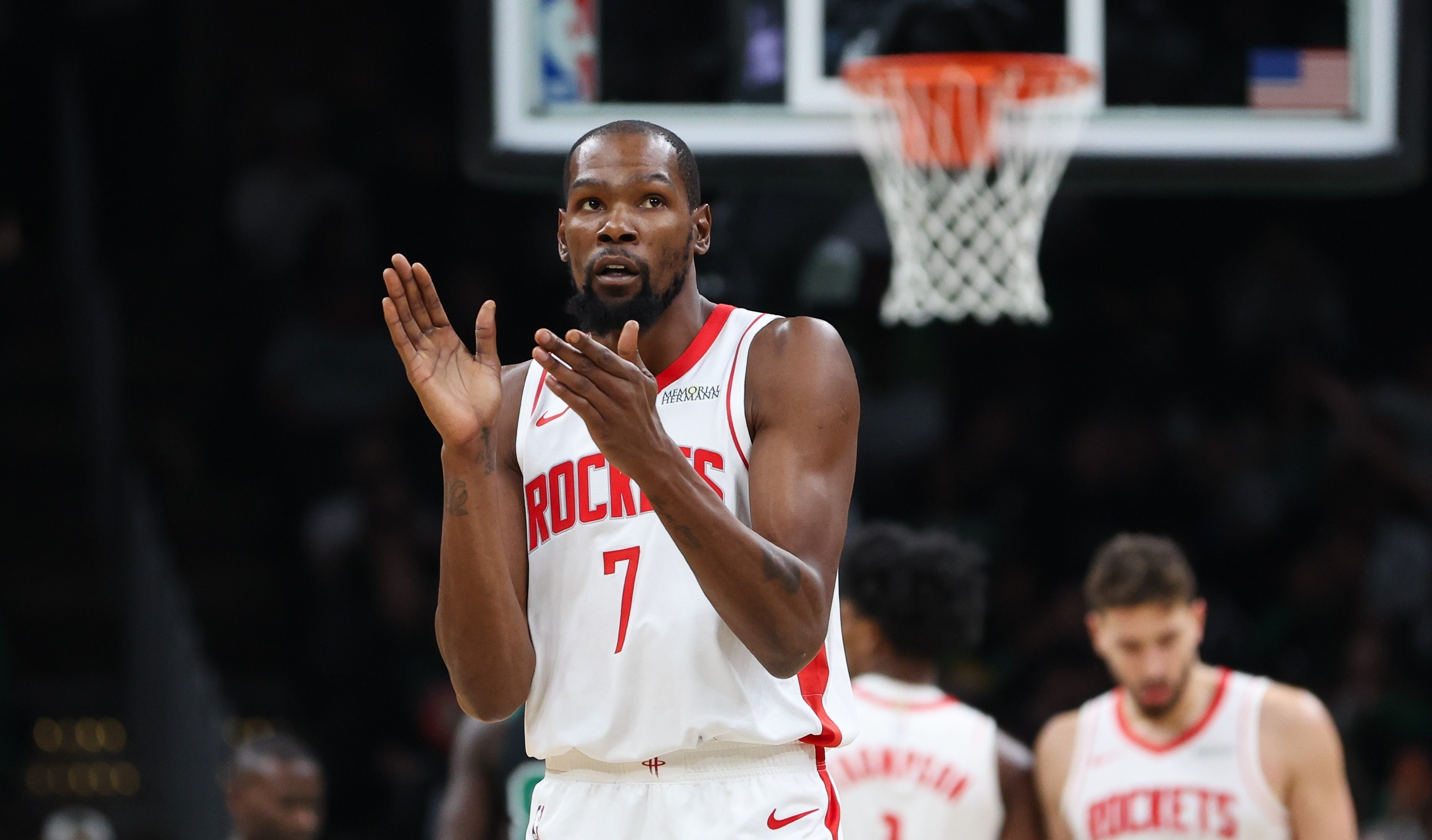 火箭最大的问题是没有好的空间破包夹,杜兰特能吸引包夹不假,但是火箭另外4打3的效果并不好,阿门、申京和奥科吉这些球员,在对方眼中都是可以放空的对象,特别是阿门远离油漆区,基本没有进攻威胁,杜兰特吸引的包夹,在申京或者阿门这里被对方放空回去,火箭并没有因为杜兰特被包夹局部4打3而得利。
