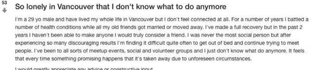 他从小就在温哥华生活,却时常感到孤独。他尝试过参加教堂活动和团体跑步,但这些依然无法让他找到合适的朋友。他甚至在Reddit上发帖寻求交友建议,却发现很多网友同样无从突破温哥华的社交壁垒。
