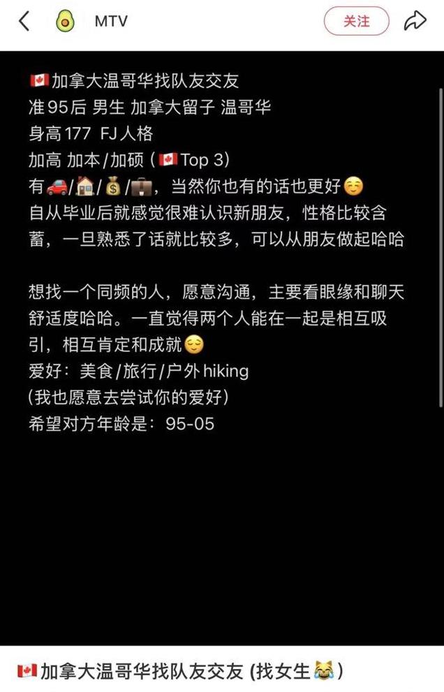 他渴望一场大啖畅聊的邂逅。此外,不少人甚至通过社交媒体直接寻觅伴侣,明确表示自己有房有车有工作,只想找个合适的人一起生活。这样的帖子在华人社交平台层出不穷,每日更新。