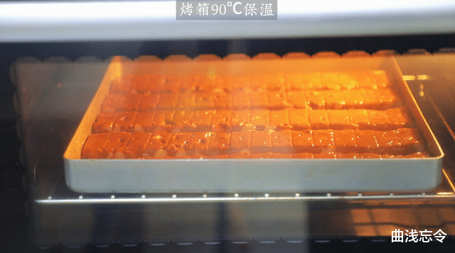 7、分切:晾大概2~5分钟左右,有点烫手但能接受的程度,大约80~90℃,将太妃糖倒扣出来。趁糖温热还比较软,迅速切成大长条,把长条放回烤箱90度保温。再切一条拿一条,确保切的时候糖是80℃左右比较好切,太软容易变形,太硬容易碎渣。