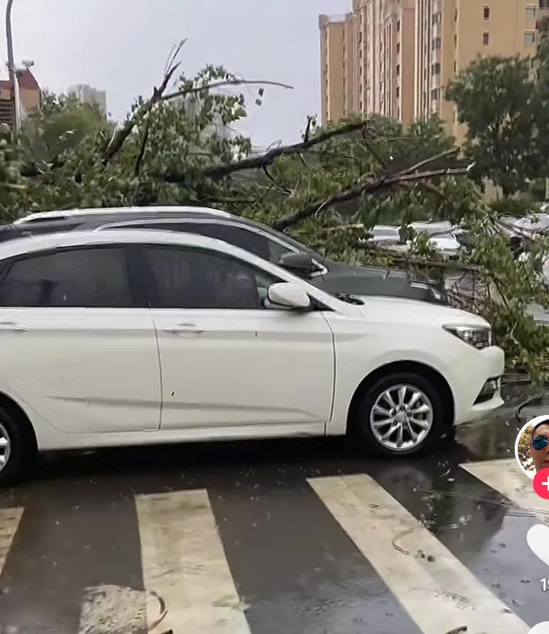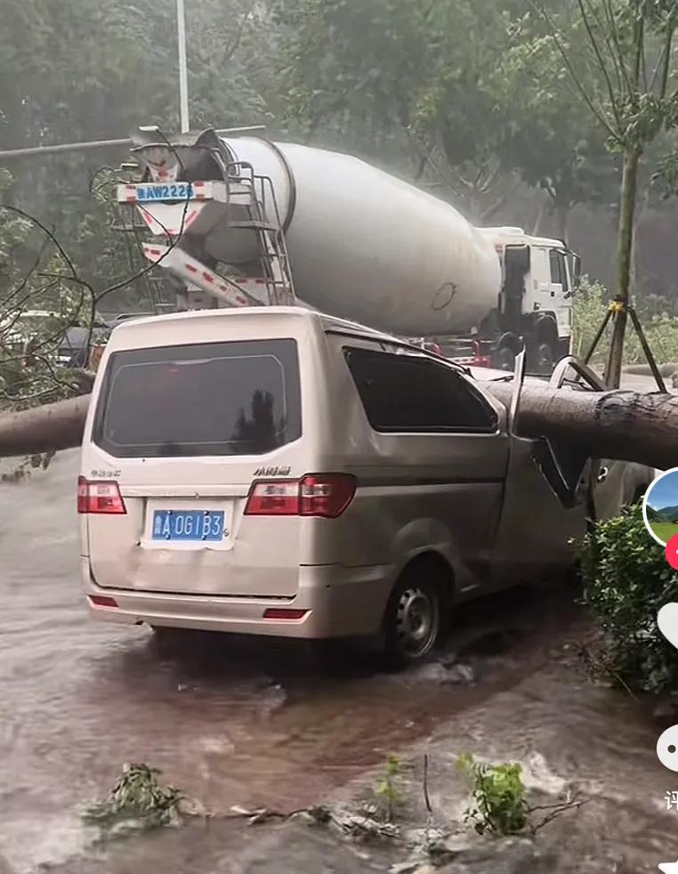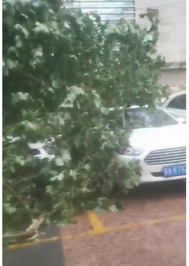 路边也能随处看到被大树压坏的汽车。