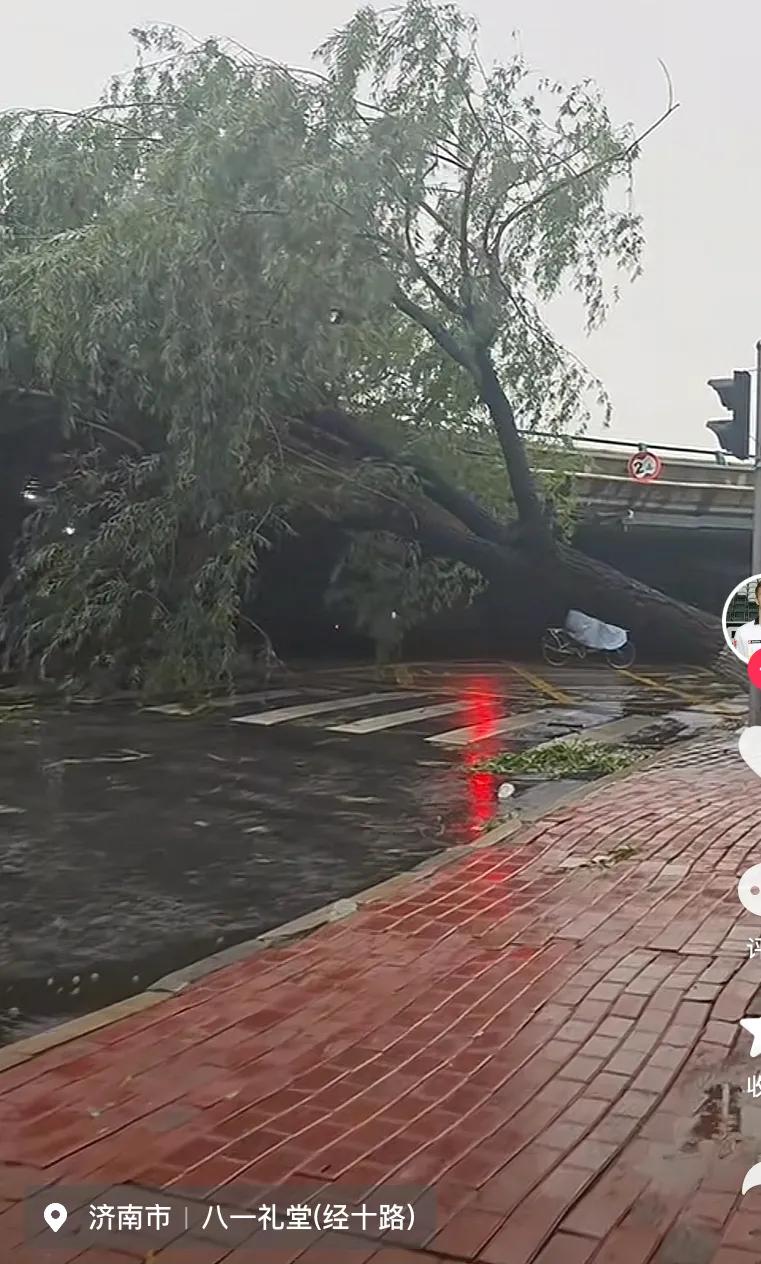 这是位于济南经10路附近,一棵腰粗一般的大柳树倒在了路中间的位置。