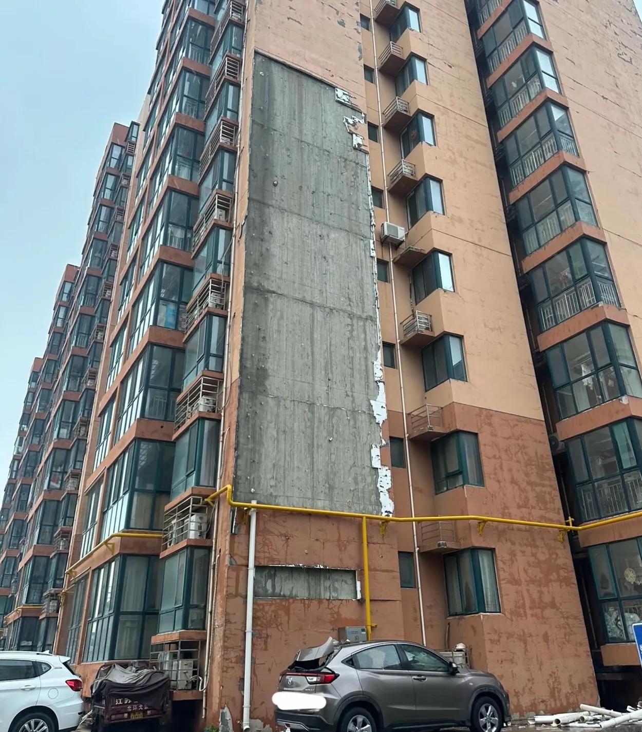 狂风暴雨导致楼的外立面整个被吹了下来,下边的一辆灰色的轿车糟了殃。