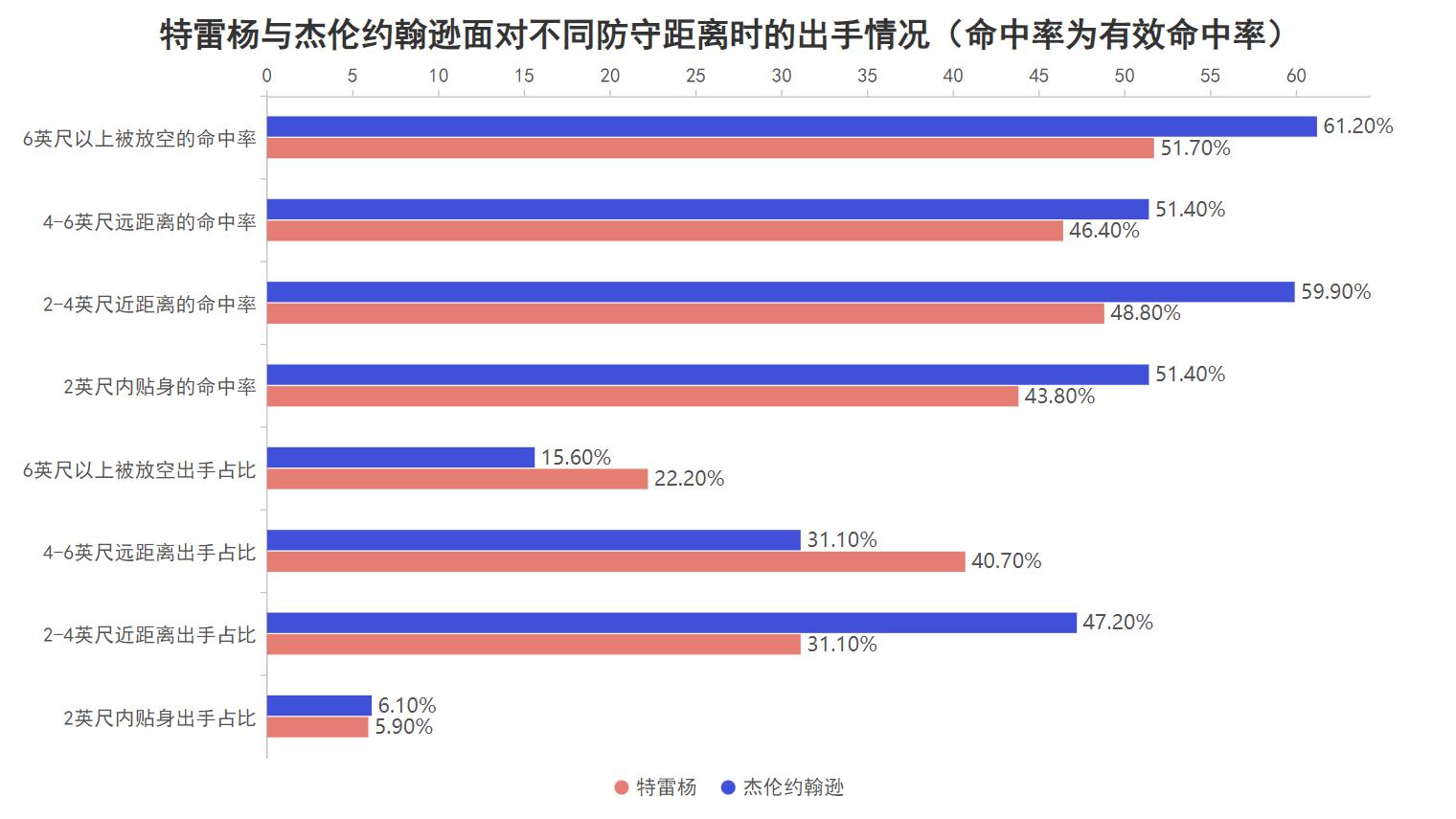 同时特雷杨受身高所限导致他在面对更高强度防守时的出手占比,以及运动战也就是结合三分出手情况的有效命中率明显低于杰伦约翰逊,这就导致特雷杨的硬解单打效果相对更差,特雷杨的上限已经得到了数次证明而更年轻的杰伦约翰逊却还没有达到上限,在二选一的情况下自然是特雷杨被老鹰所放弃,而杰伦约翰逊在目前的老鹰阵容中也与队友非常默契。