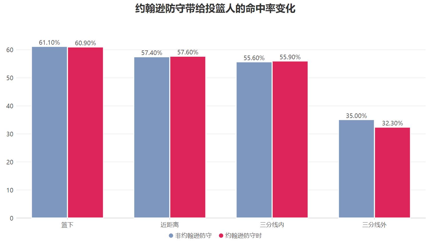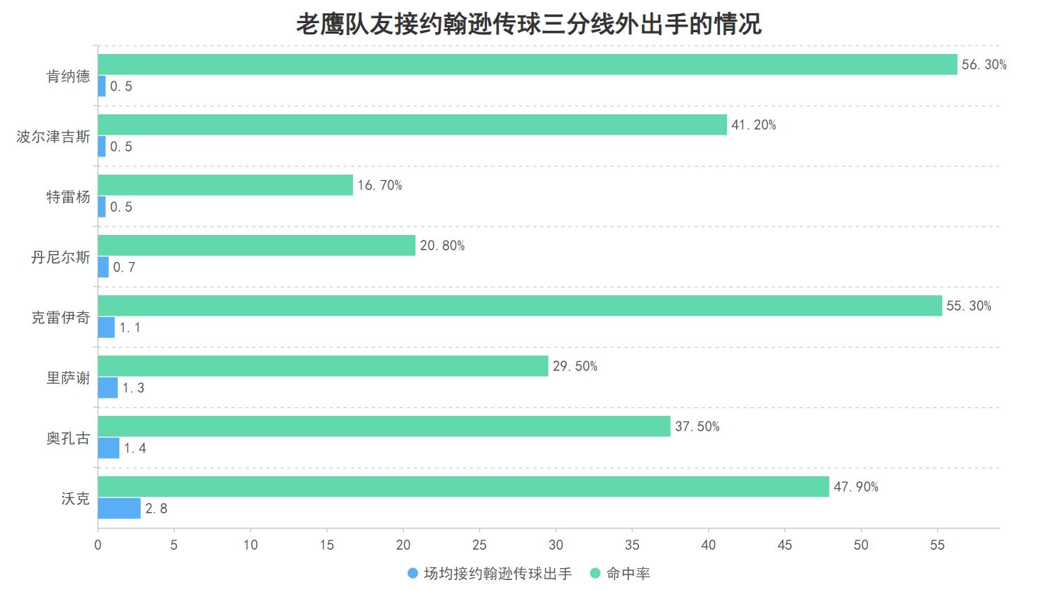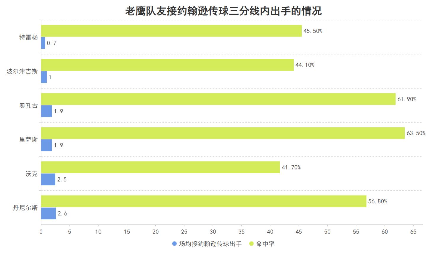 在老鹰队内场均接约翰逊传球三分线内出手0.5次及以上的六名球员里,所有队友的两分球命中率均超过了40%,其中三名球员的命中率超过了55%;