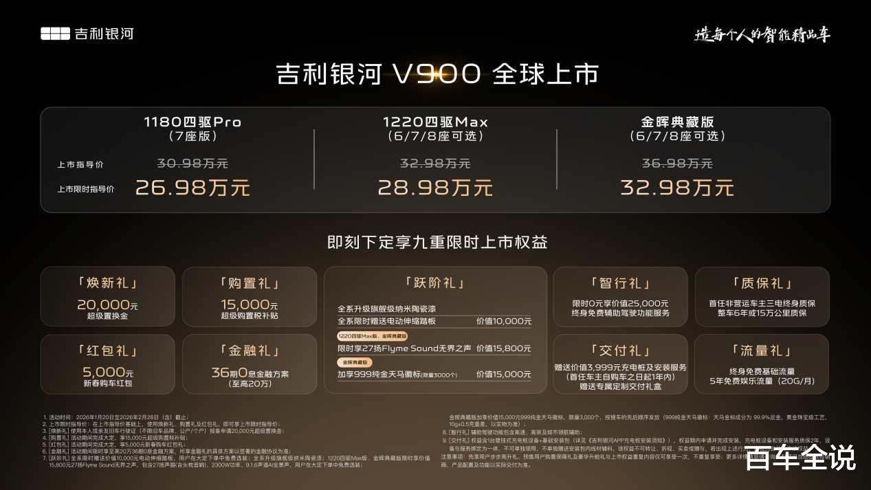 1月20日,吉利银河豪华V系列首发之作,“AI全场景家庭旗舰MPV”——吉利银河V900正式上市,共推出3个车型,上市限时指导价26.98万元-32.98万元。即日起,用户可通过吉利银河APP、微信小程序、抖音小程序及官网等官方渠道下订,下订即享焕新礼、购置礼、红包礼、金融礼、智行礼、质保礼、交付礼、流量礼、跃阶礼九重购车好礼,超高价值,一次满足,诚意拉满。