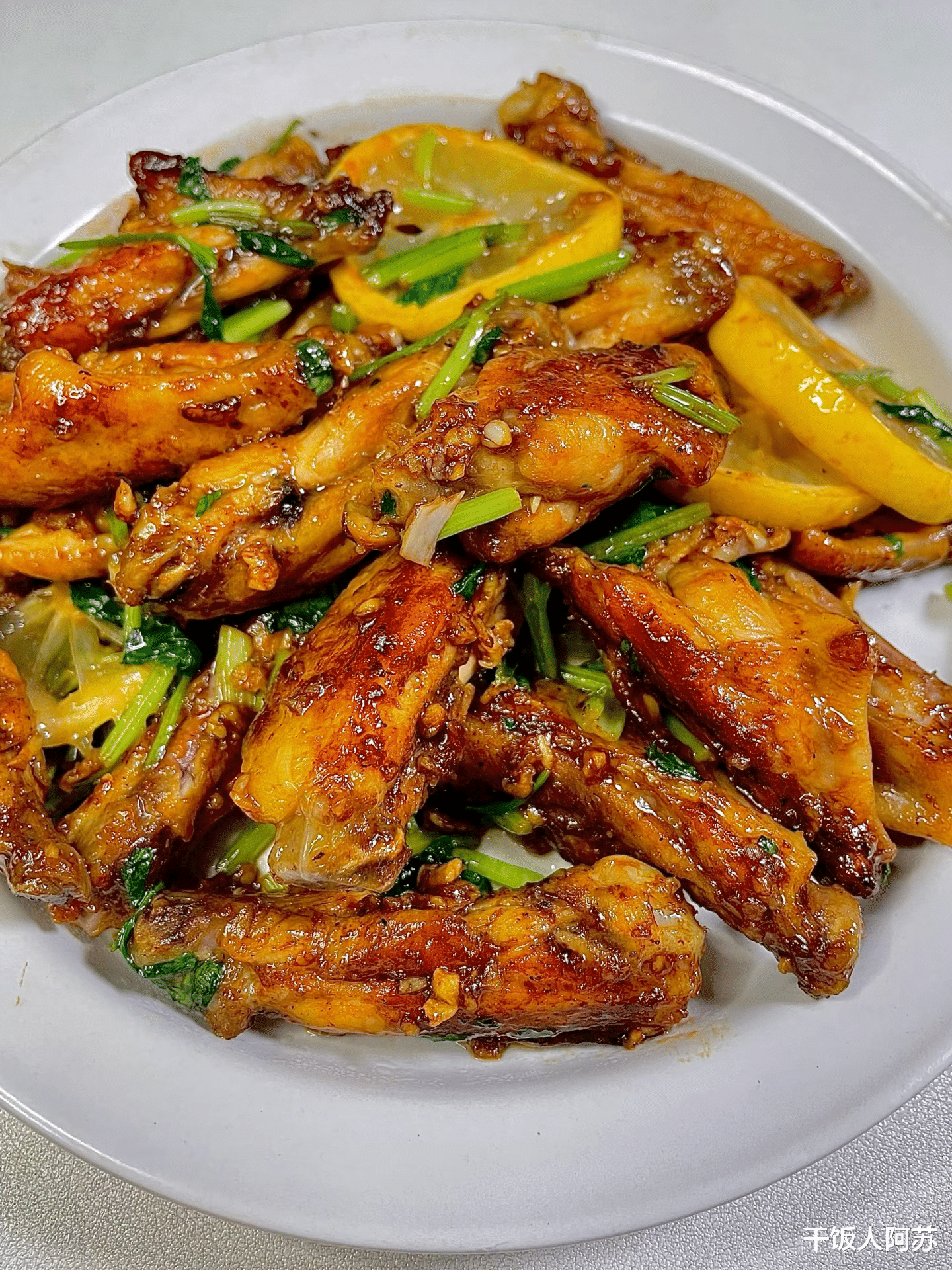 关火,盛盘。金黄色的鸡翅裹着浓郁的酱汁,点缀着翠绿的香菜和鲜黄的柠檬片,光是看着就让人食指大动。趁热吃,鸡翅外皮焦香,咬开里面鲜嫩多汁,柠檬的酸爽和香菜的清香完美融合,既解腻又开胃。这道菜特别适合搭配米饭,酱汁拌饭也是一绝。如果喜欢更酸爽的口感,可以在出锅前挤一点新鲜柠檬汁,风味会更突出。