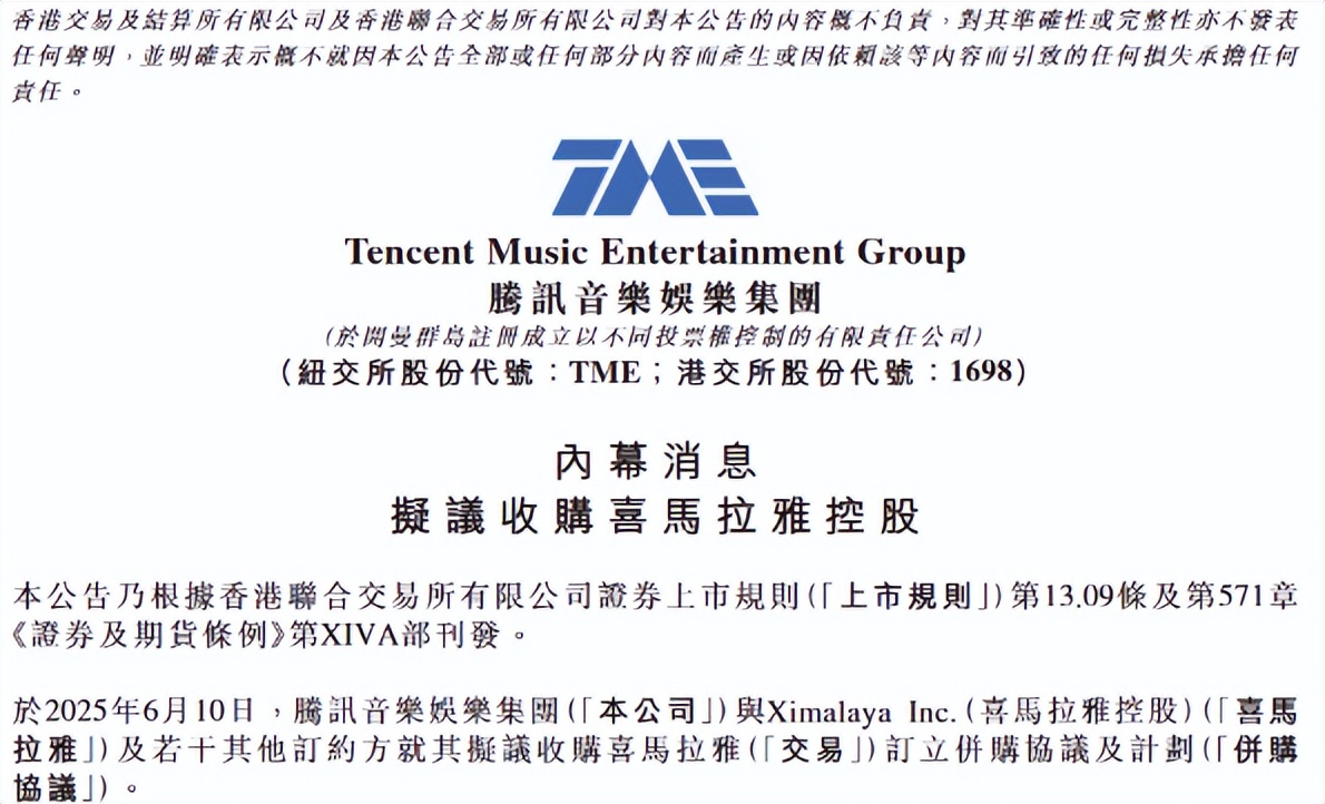 6月10日下午消息,腾讯音乐娱乐集团(以下简称“腾讯音乐”)发布公告称,腾讯音乐与中国领先的在线音频平台之一喜马拉雅控股(以下简称“喜马拉雅”)及其他若干订约方就拟收购喜马拉雅签订并购协议及计划。交易交割后,喜马拉雅将成为腾讯音乐的全资附属公司,进一步巩固其在音频内容领域的战略布局。