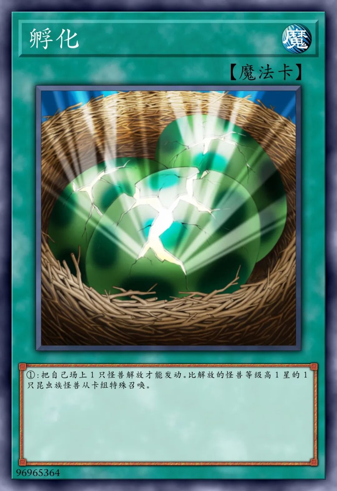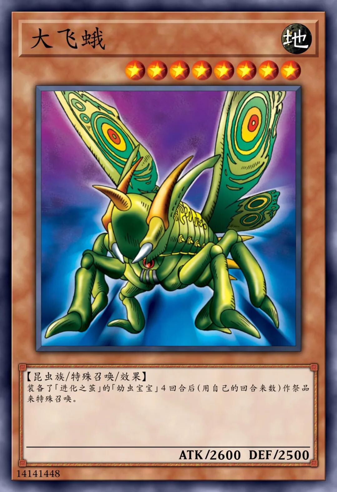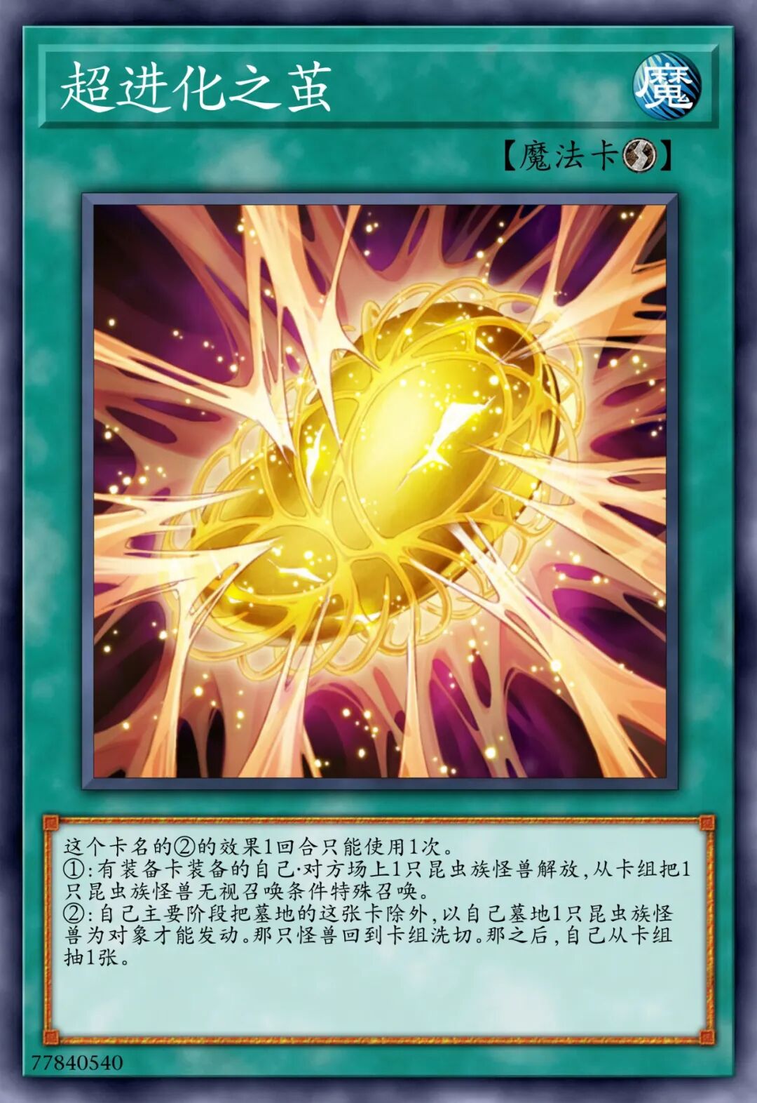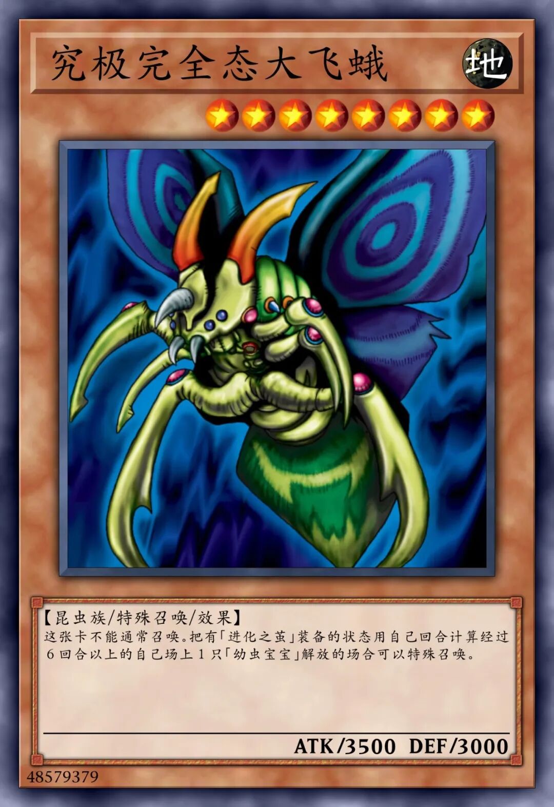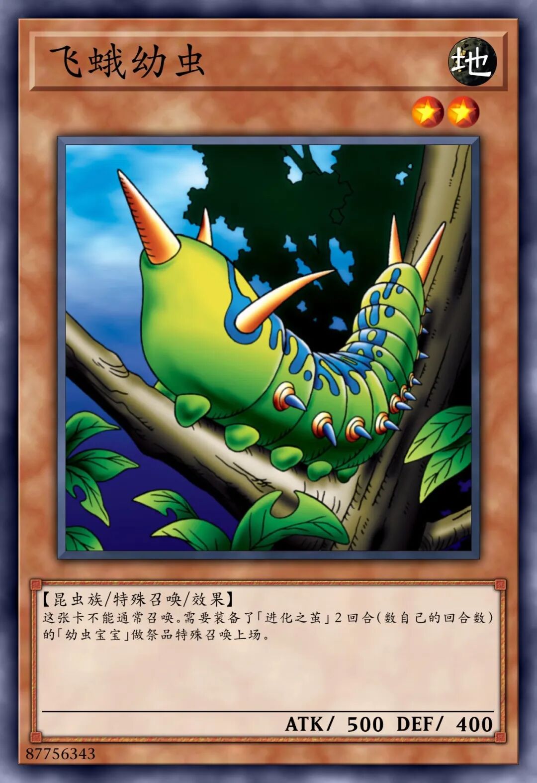这张卡不可以通常召唤。将有「进化之茧」装备的状态用我方回合计算经过6回合以上的我方场上1只「幼虫宝宝」解放的场合才可以特殊召唤。