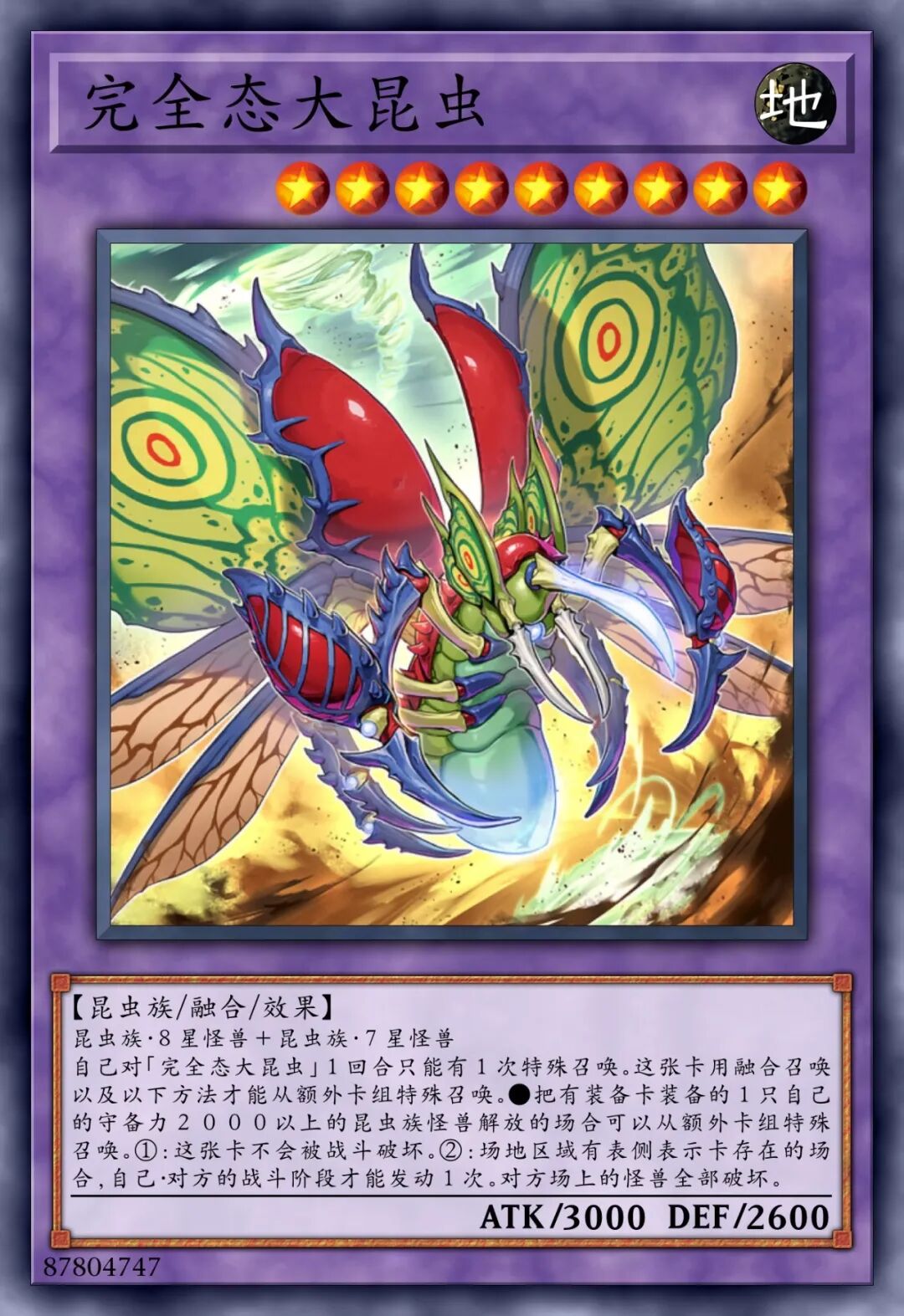 昆虫族·等级8怪兽+昆虫族·等级7怪兽自己1回合只能特殊召唤1次「完全態・完全态大昆虫」。这张卡只有用融合召唤以及以下的方法才能从额外卡组特殊召唤。●将1只装备有装备卡的自己的守备力2000以上的昆虫族怪兽解放的场合可以从额外卡组特殊召唤。①:这张卡不会被战斗破坏。②:场地区有卡以表侧表示存在的场合,自己或对手的战斗阶段有1次可以发动。将对手场上的怪兽全部破坏。