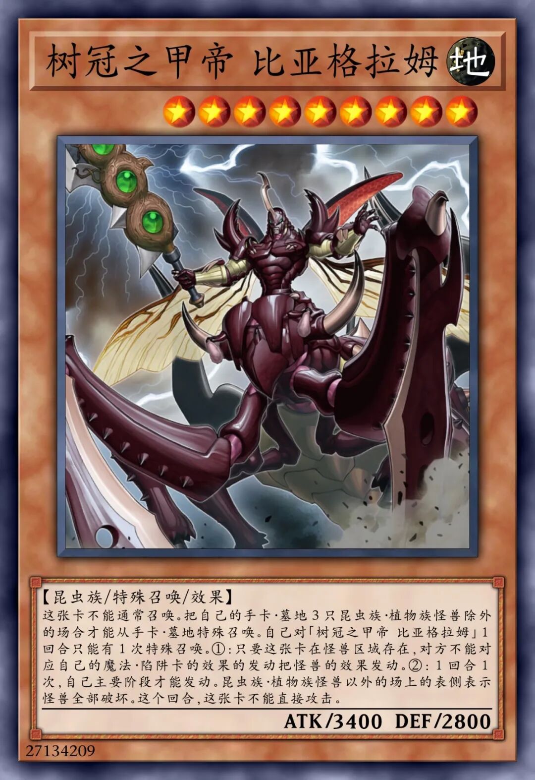 这张卡不可以通常召唤。将我方的手卡•墓地3只昆虫族•植物族怪兽除外的场合才能从手卡•墓地特殊召唤。我方对「树冠之甲帝 比亚格拉姆」1回合只可以有1次特殊召唤。①:只要这张卡在怪兽区域存在,对手不能对应我方的魔法•陷阱卡的效果的发动把怪兽的效果发动。②:1回合1次,我方主要阶段才可以发动。昆虫族•植物族怪兽以外的场上的表侧表示怪兽全部破坏。这个回合,这张卡不可以直接攻击。