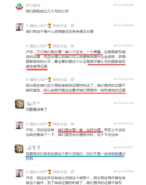 其工作人员多次作出诸如“商标局目前已审核到相关阶段”“资质证书为官方权威文件,商评委在审核时予以认可”“只要办理该证书,商标即可顺利下证”等承诺,使用大量具有误导性、诱导性的表述,并对商标复审结果作出确定性保证,严重违背相关规定,损害了委托人的合法权益。