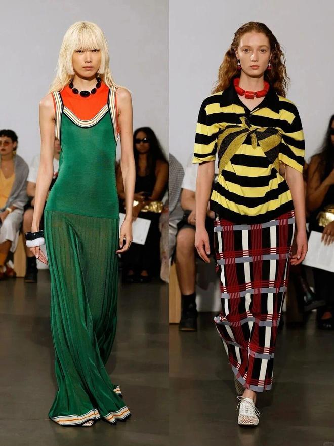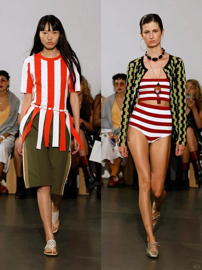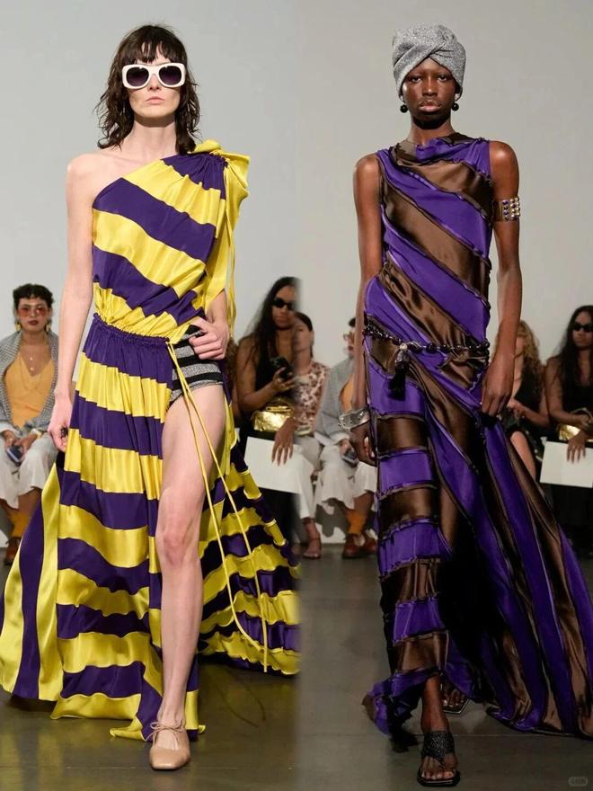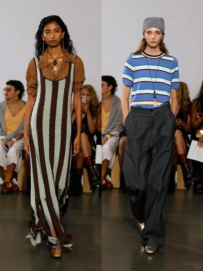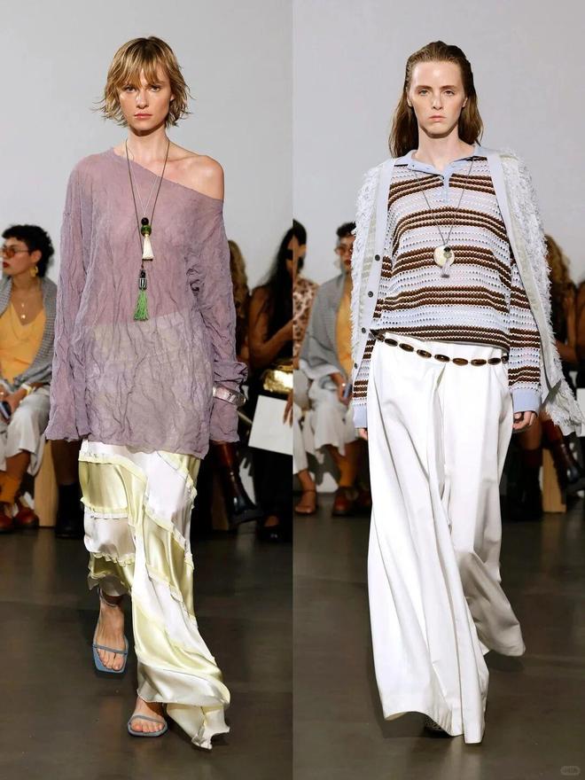 色彩大胆且富有层次,从柔和的淡紫、清新的果绿到明艳的粉红、撞色的条纹,风格跨度大却和谐统一;廓形以宽松、垂坠的剪裁为主,如阔腿裤、oversize 上衣,传递出自由无拘的穿衣态度,同时通过腰带、饰品等细节塑造腰线,平衡随性与精致。