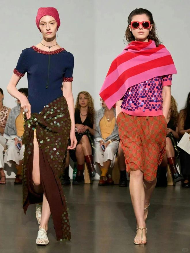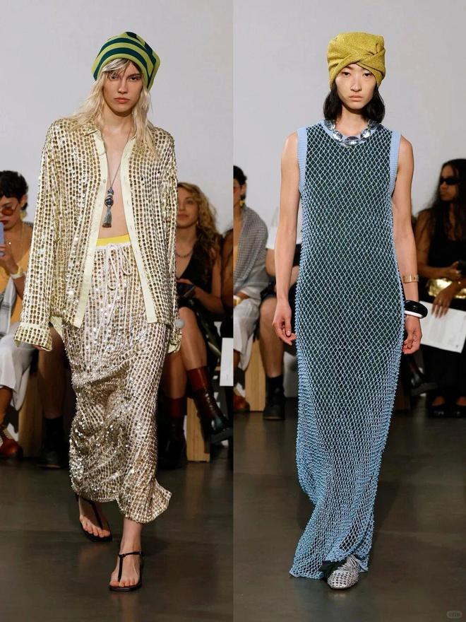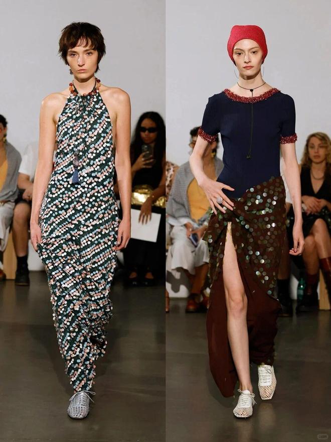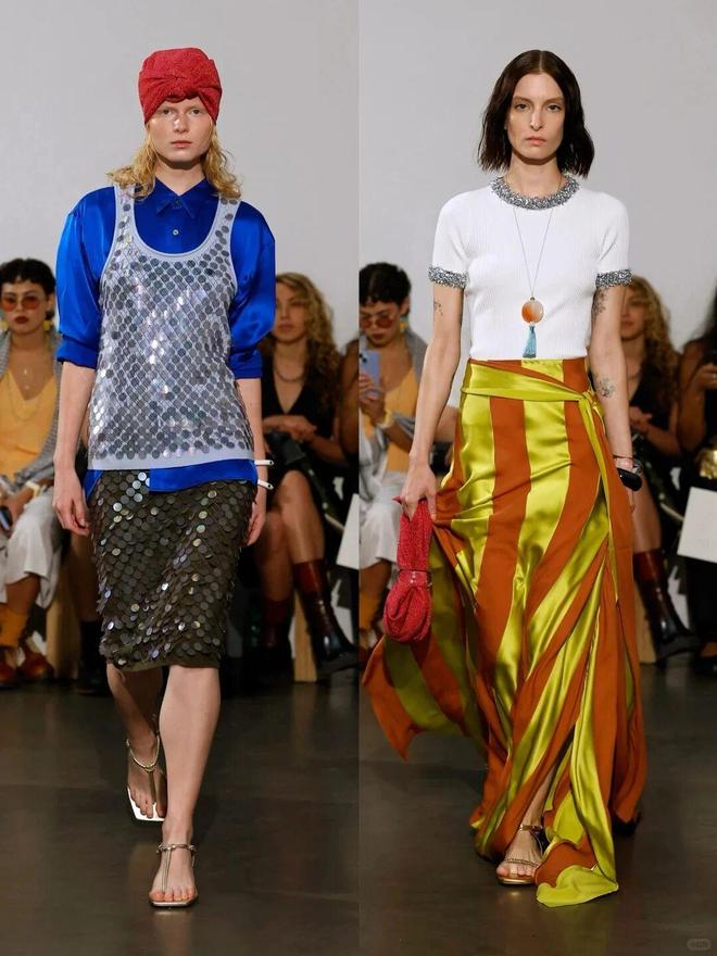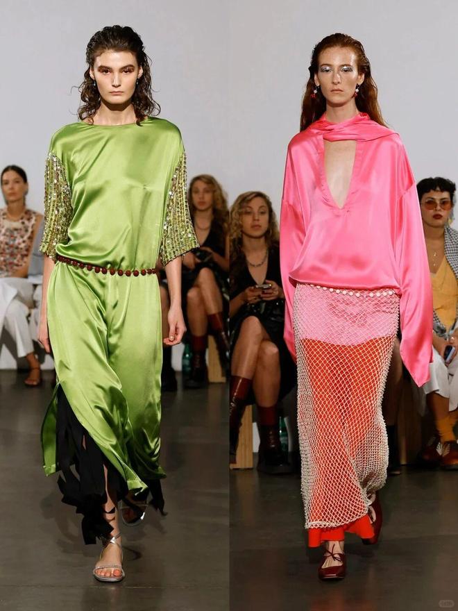 该系列大量运用真丝、缎面等富有垂坠感和光泽感的面料,搭配亮片、网纱等元素,营造出奢华又不失随性的质感,比如亮片装饰的上衣、网纱拼接的半裙,既有复古 disco 风的张扬,又有现代时装的前卫。
