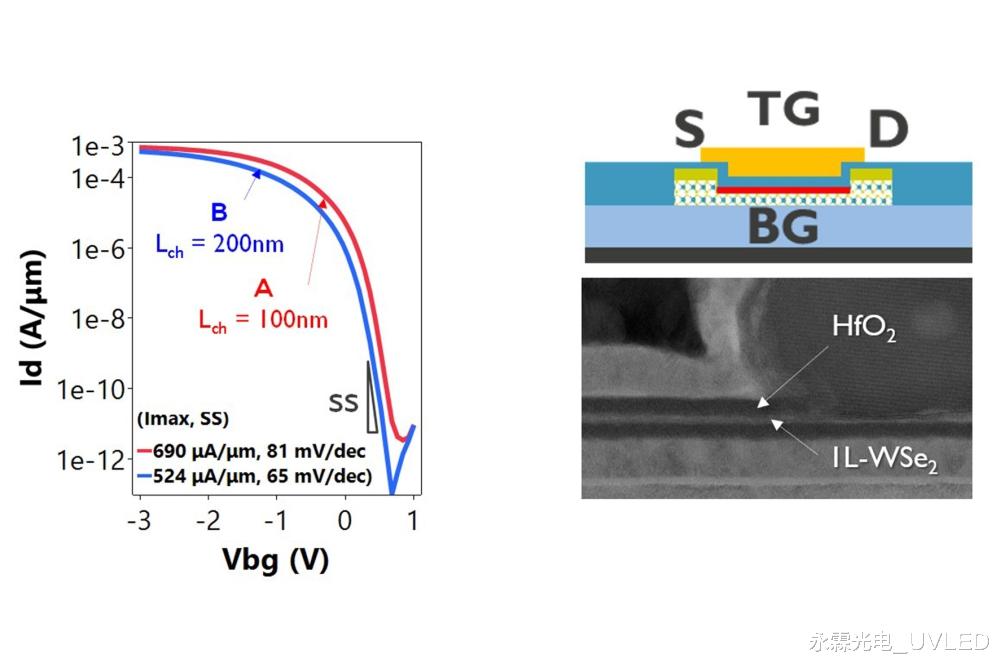 (右图) 与台积电合作完成的最终双栅极2D p型晶体管的透射电子显微镜(TEM)截面图(Lch=沟道长度;TG=顶层栅极;BG=背栅;S=源极;D=漏极;IL=界面层)。
