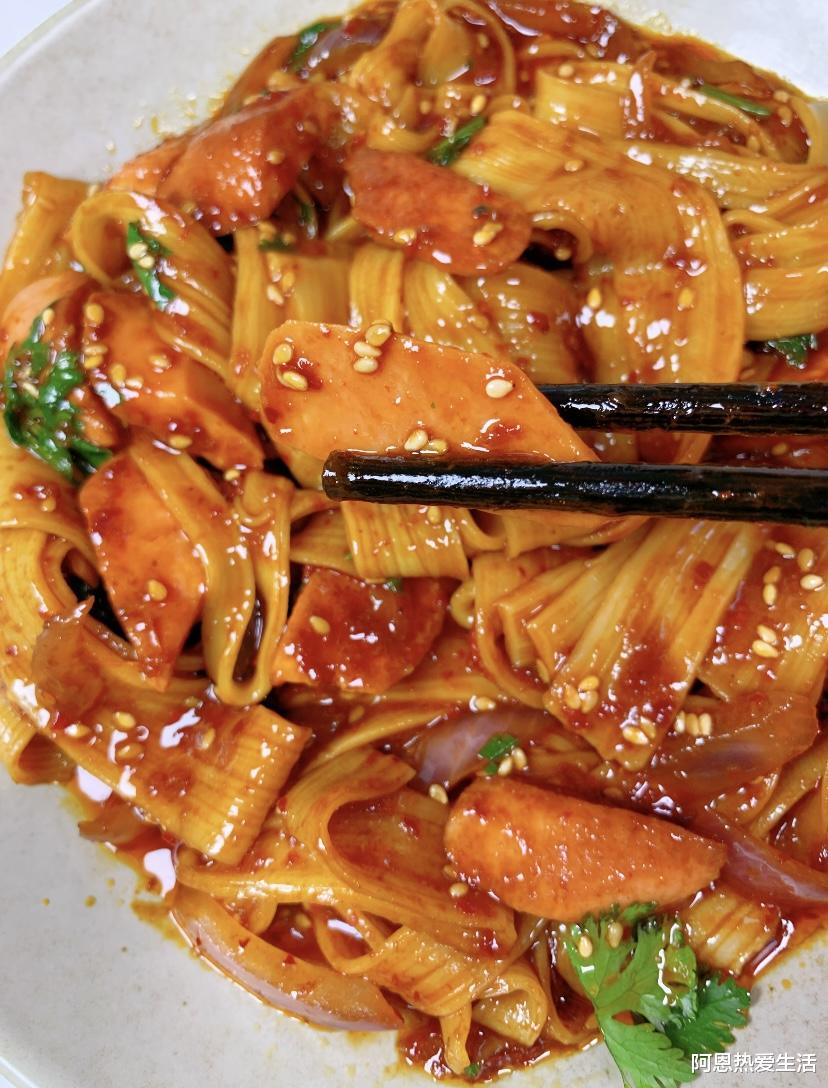 趁热吃!冷面吸饱了酱汁,变得Q弹软糯,火腿的焦香混合着洋葱的甜,每一口都是满足。