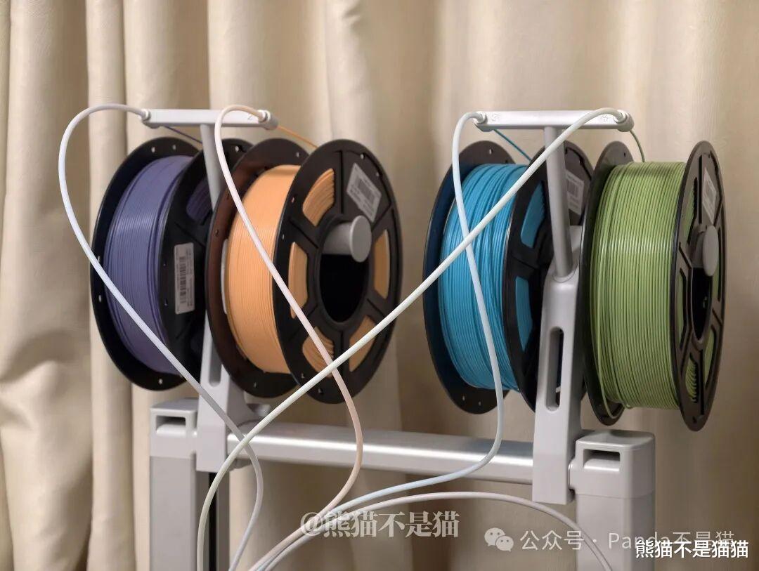 打印头的耗材序号一定要对应顶部耗材架的需要,不然会出现乱色的情况。顶部耗材架采用卡扣固定,稳定性非常不错,并且你也可以打印makeronline社区对应的KX顶部卡扣模型,实现放置干燥箱的效果,实测是支持这个重量的。
