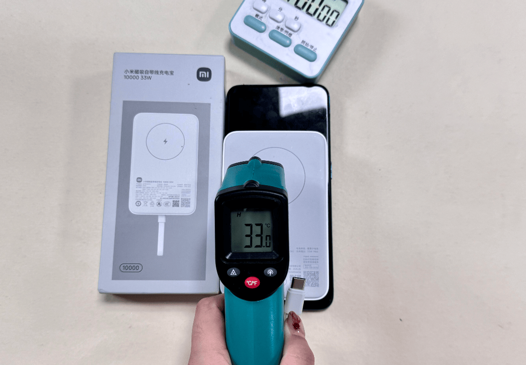 在测评过程中,小米这一款充电宝温度上升到了33.0℃,在控温技术上,这一款充电宝搭载了NTC智能控温,由于有磁吸充电,所以在控温、散热上的表现是还有待提高的。