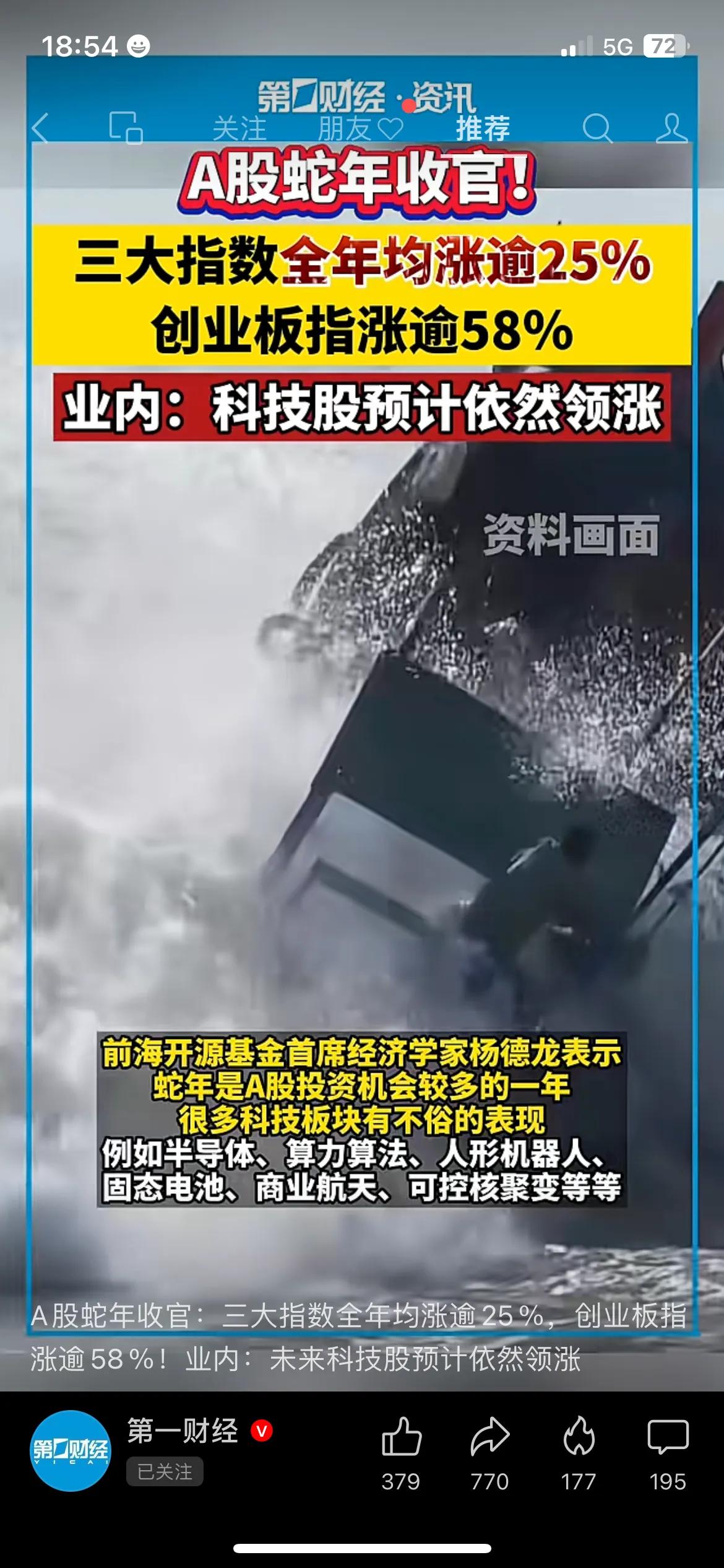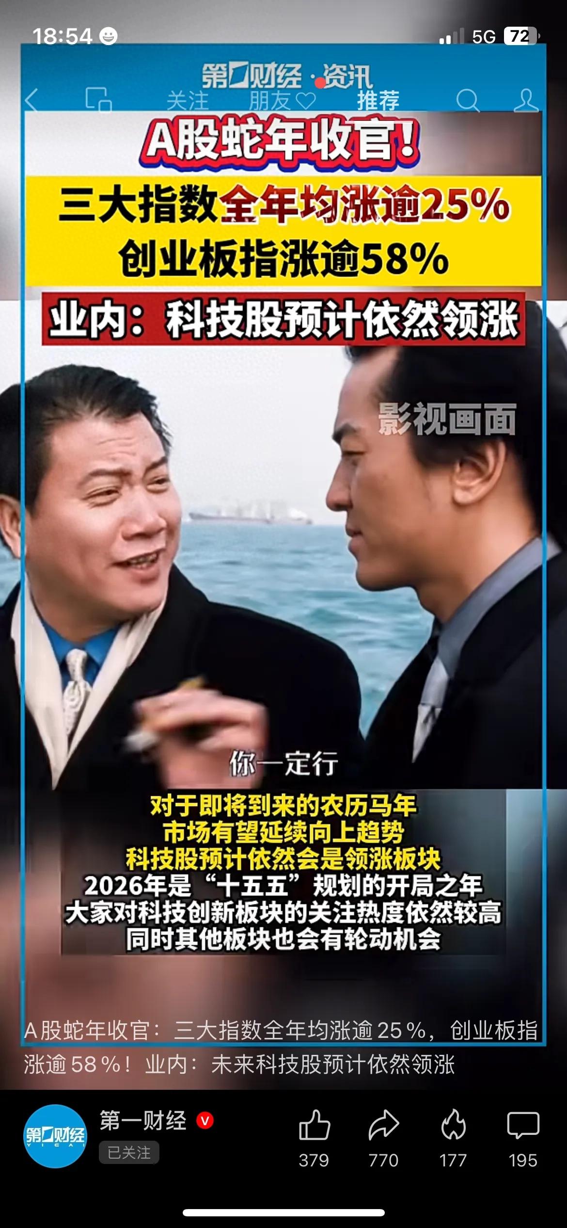 蛇年A股正式收官,先看一组实打实的成绩单:沪指全年涨超25%,深证成指涨超38%,创业板指狂涨58%。不管你今年赚没赚到,都不能否认,这是A股近几年表现最亮眼的年份之一。