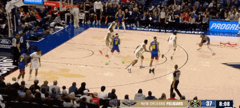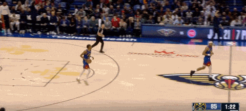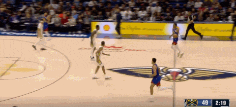 这个回合掘金打弧顶三人转,纳吉持球,沃特森起初想帮助穆雷掩护接球,但鹈鹕防的很紧,于是沃特森直接和纳吉手递手调整一步面对奎因直接出手中距离投篮。