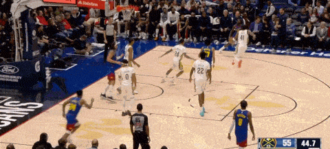 掘金这次底线球打Lift stagger,沃特森扮演了过去约基奇接球的角色,穆雷发球后利用双掩护兜出至三分线外,沃特森快速送出传球助攻穆雷命中三分。