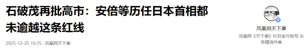 国内反对声起12月25日接受媒体采访时,石破茂明确表示,高市的涉台言论等同于“台湾有事就是日本有事”,而这与日本历届政府的立场完全相悖。