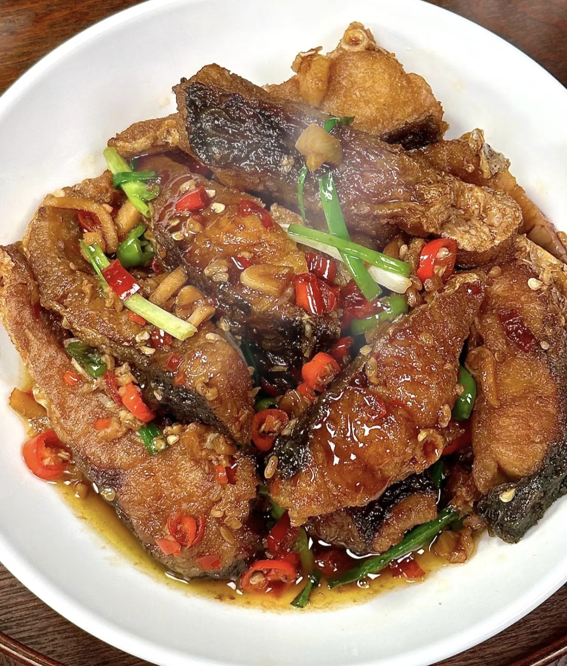 锅里留2勺油,转小火,放入花椒和干辣椒炸香,捞出丢掉(留油就行)。放入蒜末炒出香味,立刻加1勺郫县豆瓣酱,炒出红油(火别大!容易糊)。把调好的酱汁倒进锅里,煮到冒泡,加半碗清水(刚好没过鱼块)。把炸好的鱼块轻轻倒进锅里,用铲子翻匀,让每块鱼都裹上酱汁。盖锅盖,转小火炖5分钟,让鱼块充分吸收酱汁的味道。开盖转大火,翻炒几下,等汤汁变浓稠,淋1勺陈醋(二次提酸!),撒点葱花,翻两下立刻关火!
