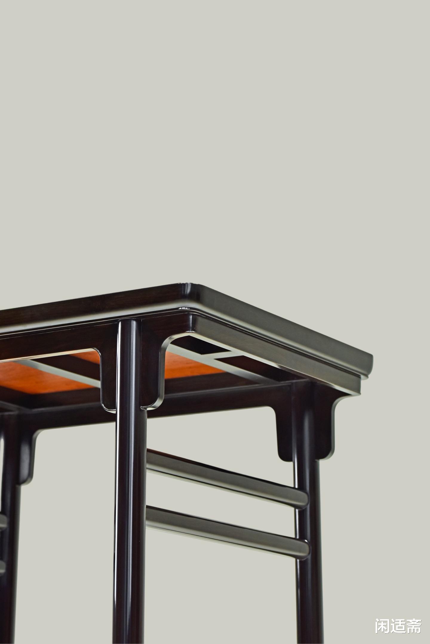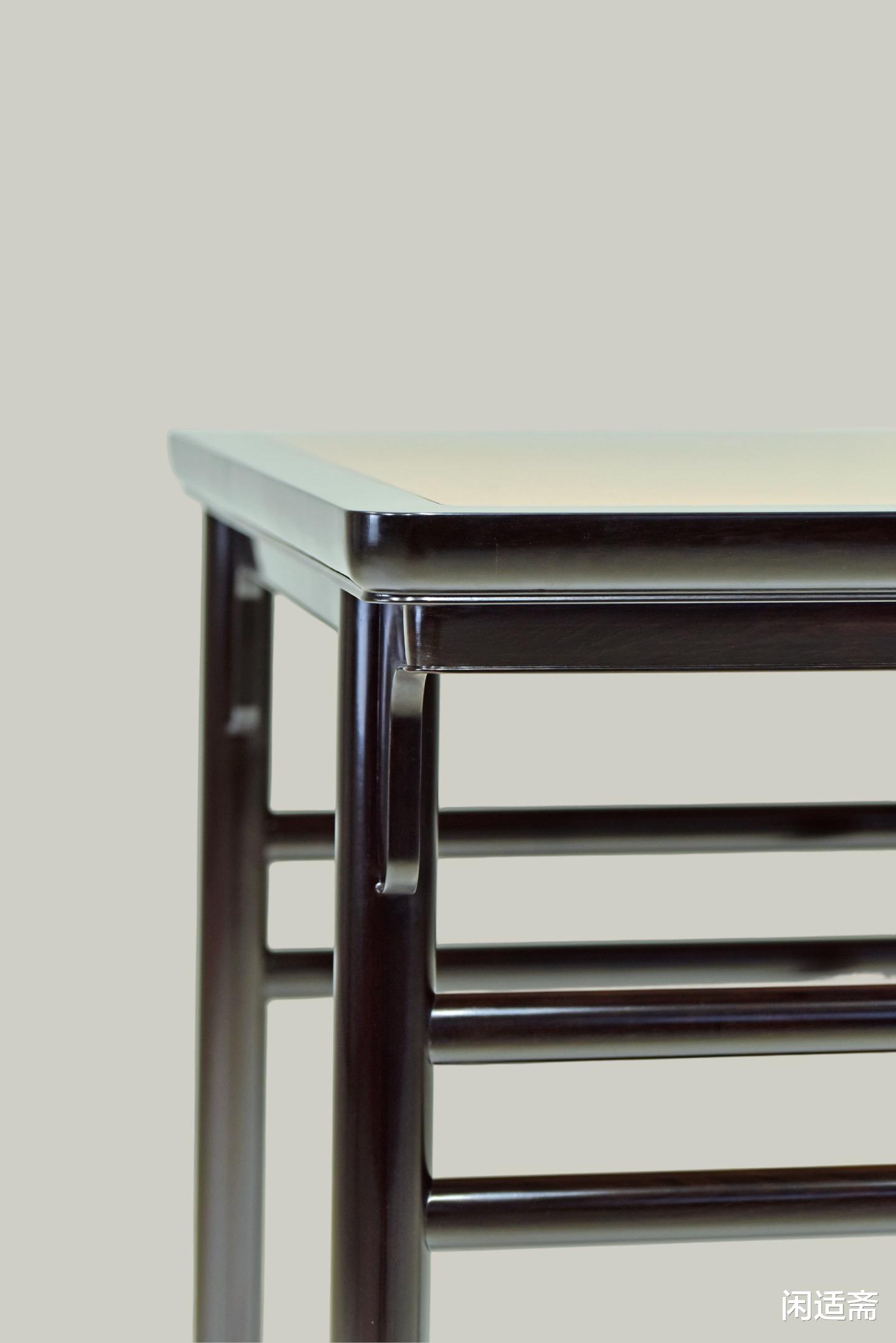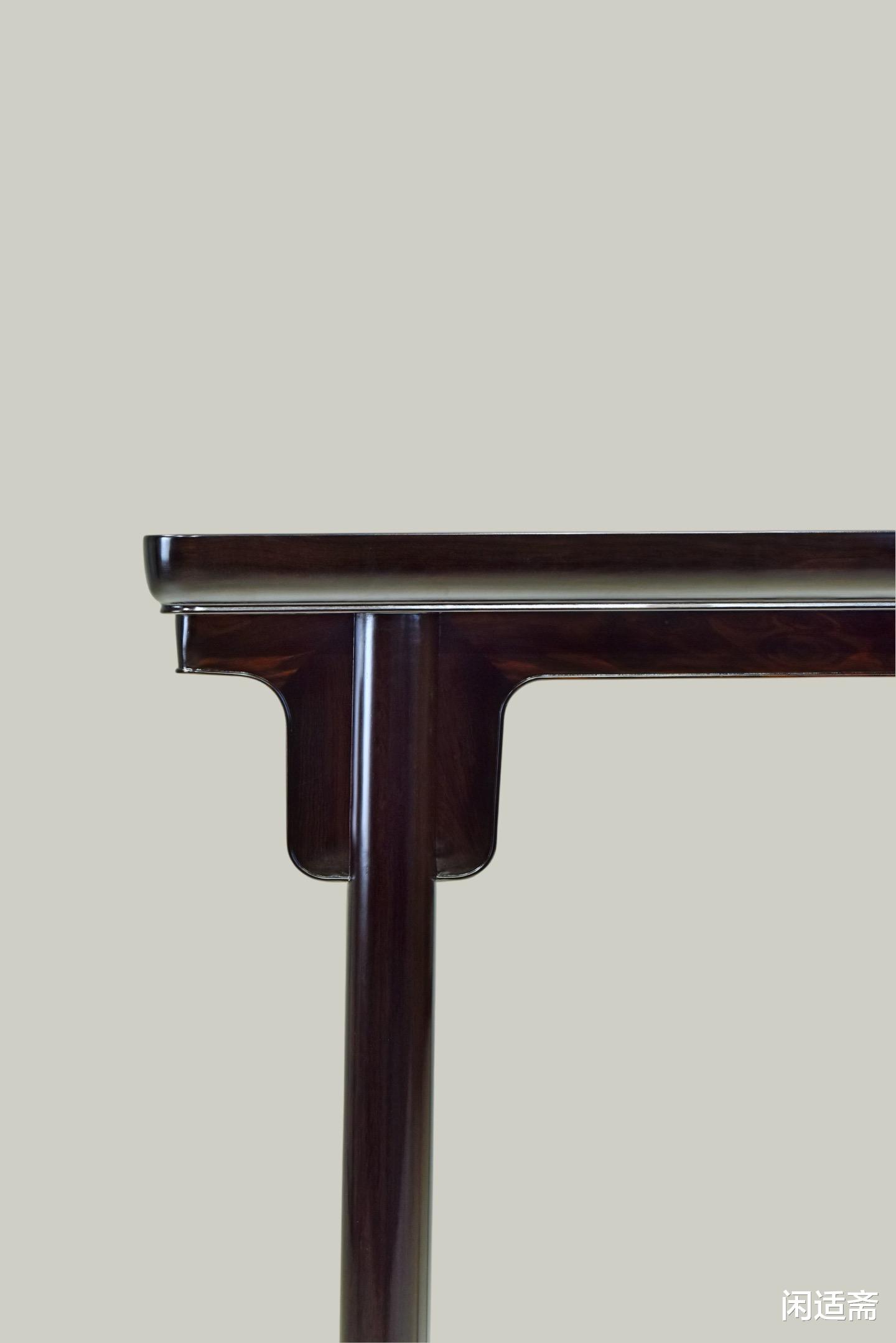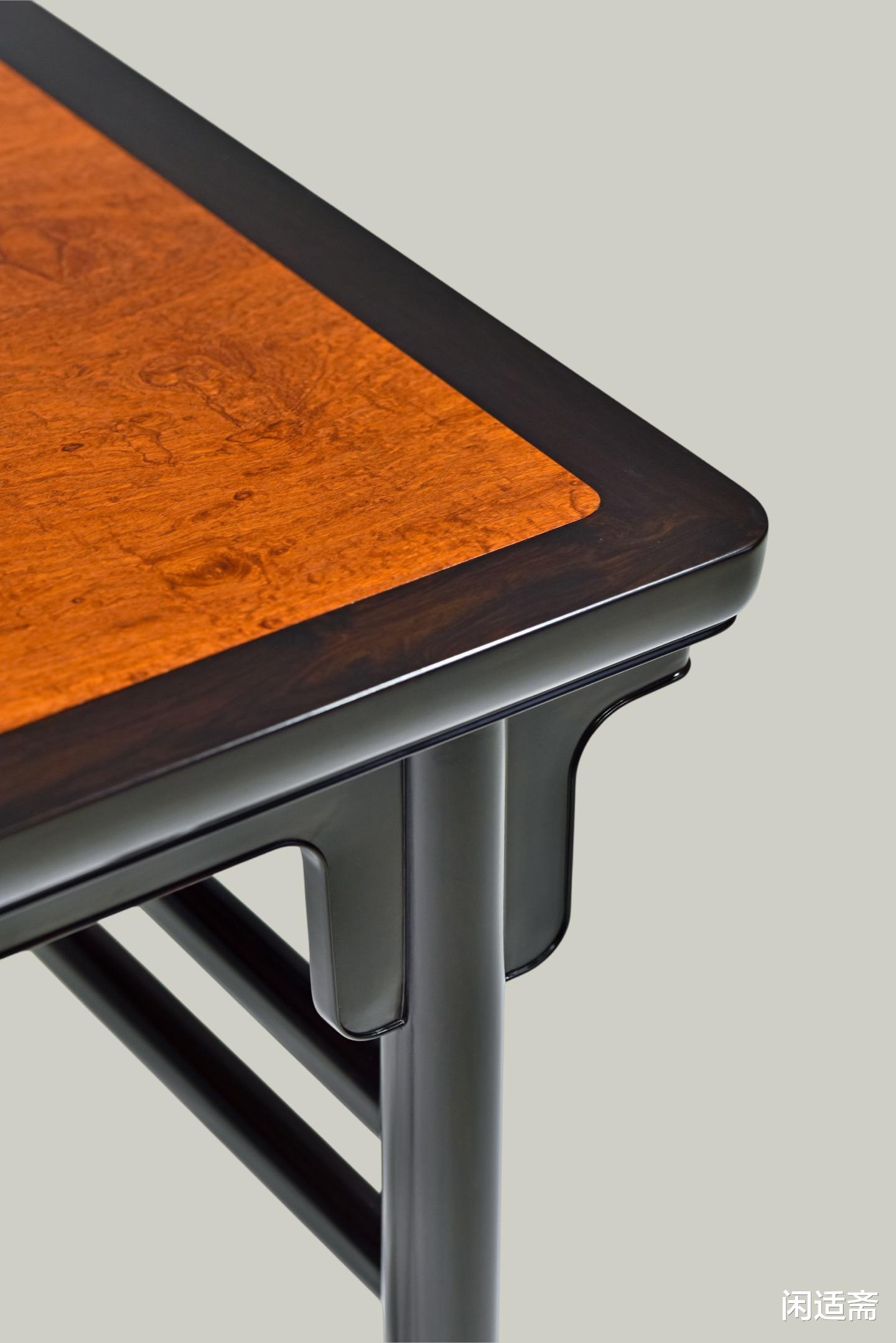面框制作遵循明式“窄暗宽”古法,外看简约利落,无冗余装饰,内里暗藏厚实肌理,将稳固性藏于简约造型之中,既符合明式家具“简而不凡”的审美追求,又最大化提升了面框的承重性能与耐用性。桌边设计独具匠心,摒弃普通冰盘沿、阳线工艺,独制碗口线造型,弧度圆润细腻,打磨得光滑如玉,触感柔和不生硬,观感上更显温润雅致,相较于传统线条更具辨识度,细节处彰显复刻工艺的精湛。