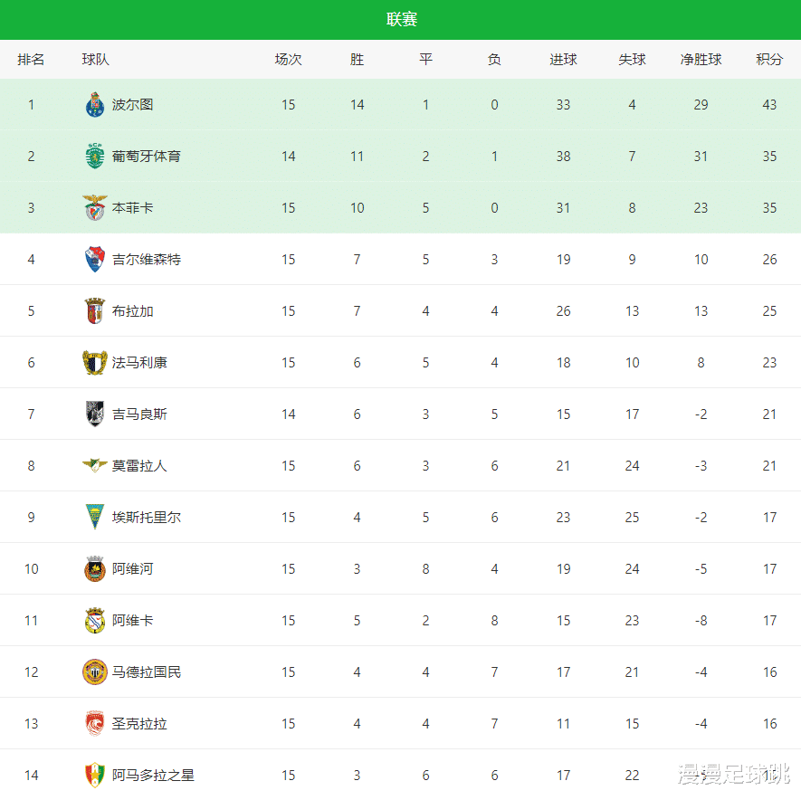目前领头羊波尔图联赛也是保持不败,目前领先本菲卡高达8分之多,15场联赛拿下14场胜利,唯一一场平局就是战平穆里尼奥的球队,状态更是稳如老狗,波尔图成为本赛季夺冠头号大热门,完全是实至名归。所以,狂人想要夺得冠军奖杯,还是从两大杯赛下手更为现实,至于联赛,踢好自己的球就行,如果对手犯错,那么或许有些机会逆转的可能。加油吧,62岁的小老头。