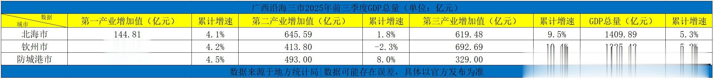根据2025年前三季度的数据,广西沿海的北海市、钦州市和防城港市在经济发展方面呈现出各自不同的特征。本文将从总量、产业增长及整体表现三个方面对三市的数据进行梳理和分析。