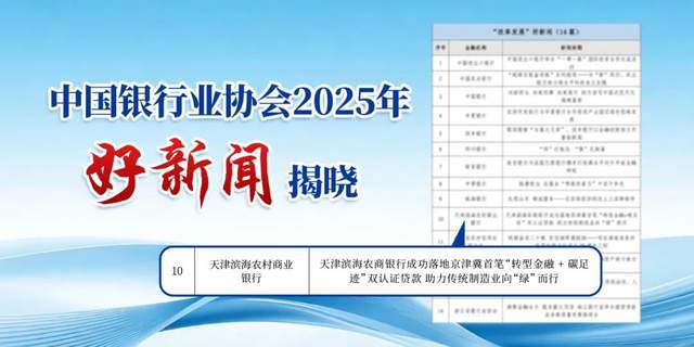 27、3月17日,中国银行业协会发布“2025年银行业好新闻”评选结果,天津滨海农商银行行报送的新闻《天津滨海农商银行成功落地京津冀首笔“转型金融+碳足迹”双认证贷款助力传统制造业向“绿”而行》获评2025年银行业“改革发展”好新闻,这也是该行连续三年荣获“中国银行业好新闻”。中国银行业协会已连续14年开展银行业“好新闻”发布活动,在业内具有较高的参与度和权威性。