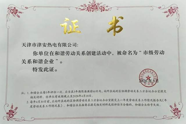 36、日前,天津市人社局等五部门联合发布《市人社局等五部门关于命名天津市劳动关系和谐企业的决定》,天津能源集团津安热电公司凭借在和谐劳动关系方面有力保障职工权益、提升企业凝聚力的扎实成效,荣获“天津市市级劳动关系和谐企业”称号,充分彰显了企业在促进劳动关系和谐稳定、助力高质量发展中的责任与担当。