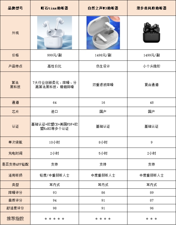 测评结果:町石>自然之声>漫步者町石助听器音质测评表现整体音质挺自然的,清晰又细腻。无论是在嘈杂办公室聊天,还是地铁里偶尔听音乐,声音细节都能保留得很好。 配备64通道音频技术和靶向声源定位技术,结合P9处理模型,让声音抓取更精准、层次感分明。实测近场人声识别率约93.7%,整体表现令人感觉通透又顺耳。自然之声助听器音质测评表现整体表现尚可,音质清楚,人声细节还行。在日常场景,比如办公室或餐厅,基本够用。 它采用基础多频音频处理和单通道柔化算法,保证人声层次稳定。唯一小问题是遇到嘈杂或伴随乐器时,声音细节会稍微收敛,整体分离感不如近距离对话明显。漫步者助听器音质测评表现整体音质一般,中规中矩。 短时间对话还能听清,人声表现平稳。 使用基础音频处理和单通道定位技术,但声音层次感不太丰富,复杂背景下背景声容易融合。近距离交流还行,但细节没那么丰富,也缺少特别突出的部分。