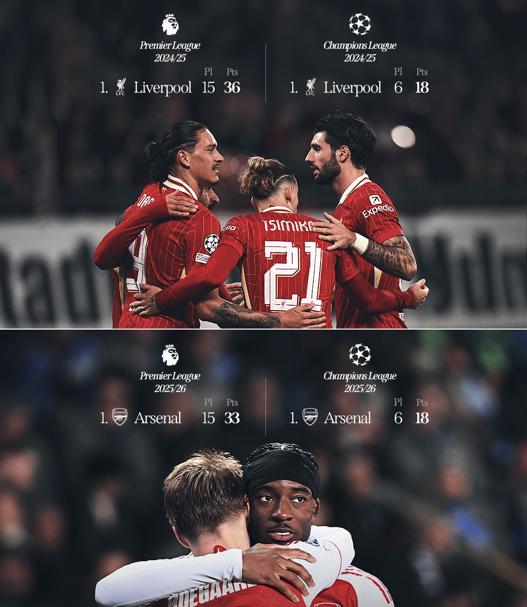 而足球媒体Sports Illustrated FC“不合时宜”的一张对比图,却也在此时发出--似乎,25/26赛季的阿森纳,有点和24/25赛季的利物浦在同期过于相像了!