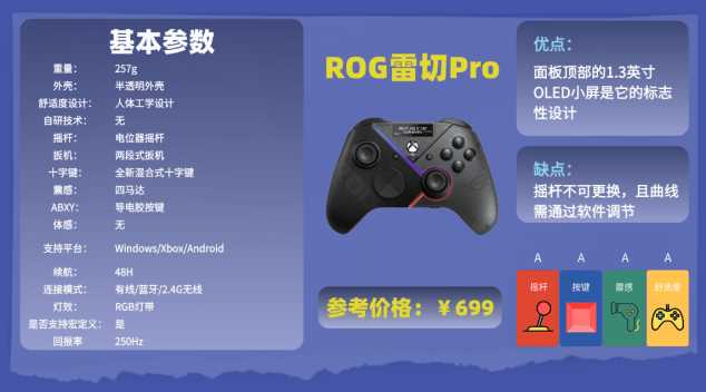 2:按键字符切换操作灵活,只需拨一下,按键显示便自动切换,无需驱动或插拔配件,体验顺畅。摇杆升级为TMR青龙摇杆,支持无极力度调节,仅新手初上手可能觉得略紧,首次调节会有“卡卡”感。扳机为两段式霍尔线性结构,短行程可实现《街霸6》秒触发,长行程能在《地平线5》精准控制油门深度。震动反馈介于Xbox的强劲与SwitchPro的细腻之间,属第三方手柄中成熟水准。续航一次可玩8小时,日常使用几天充一次电即可。