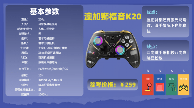 1:这款手柄透明外壳带磨砂涂层,既有机能感又不易落指纹,握把背部的激光防滑纹很实用,湿手时也能稳定握持。260g左右的重量搭配均衡配重,没有空壳廉价感。延续可更换摇杆与十字键设计,标配八向轮盘,还附四向键和高摇杆,能适配动作、赛车等不同游戏;仅四向键手感偏松散,格斗类搓招需适应。霍尔摇杆抗漂移,ABXY升级为微动开关,响应爽快适合连击,只是长时间点击“清脆感”较强,静音需求玩家需适应;背部新增两枚拨片式背键,位置易按、错手率低。