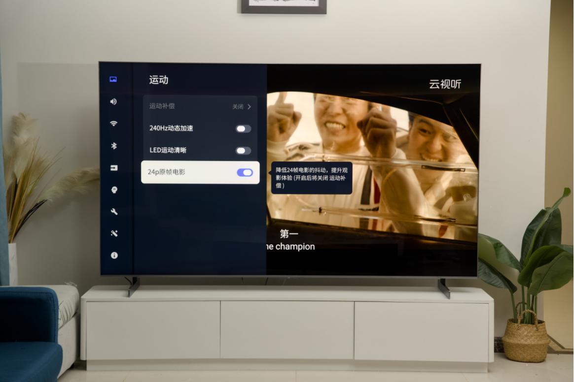 系统方面,除了TCL一贯的无开机广告、快速启动切换外,我还发现了一个非常实用的功能:24p电影画面补偿。不同于会明显增加画面果冻感和细节抖动的MEMC,这个24p补偿可以在减少果冻感的前提下,弱化24p画面在运动时的闪烁感,对提升大屏观影体验非常重要。