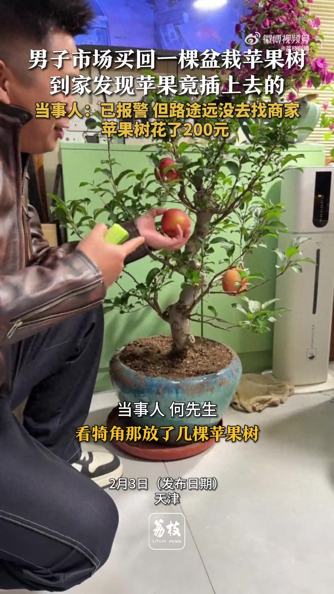 近日,天津一男子从花卉市场买回一棵盆栽苹果树,到家发现树上的苹果根本不是自然生长的,而是被人工插上去的。